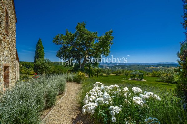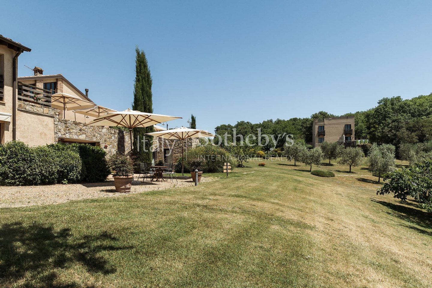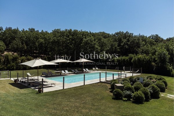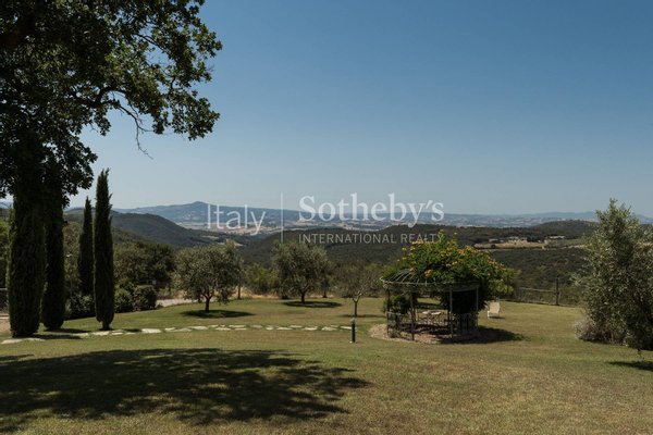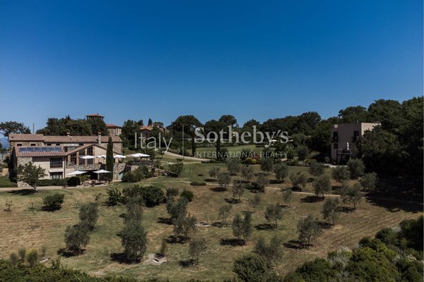 Die Anlage ist von einem wunderschönen Park von ca. 1,5 Hektar umgeben, der komplett eingezäunt ist, bestehend aus einer herrlichen Rasenfläche mit Swimmingpool, Olivenhain, Obstbäumen, Zypressen, Steineichen und Eichen sowie anderen mediterranen Essenzen und einem gepflegten Gemüsegarten.