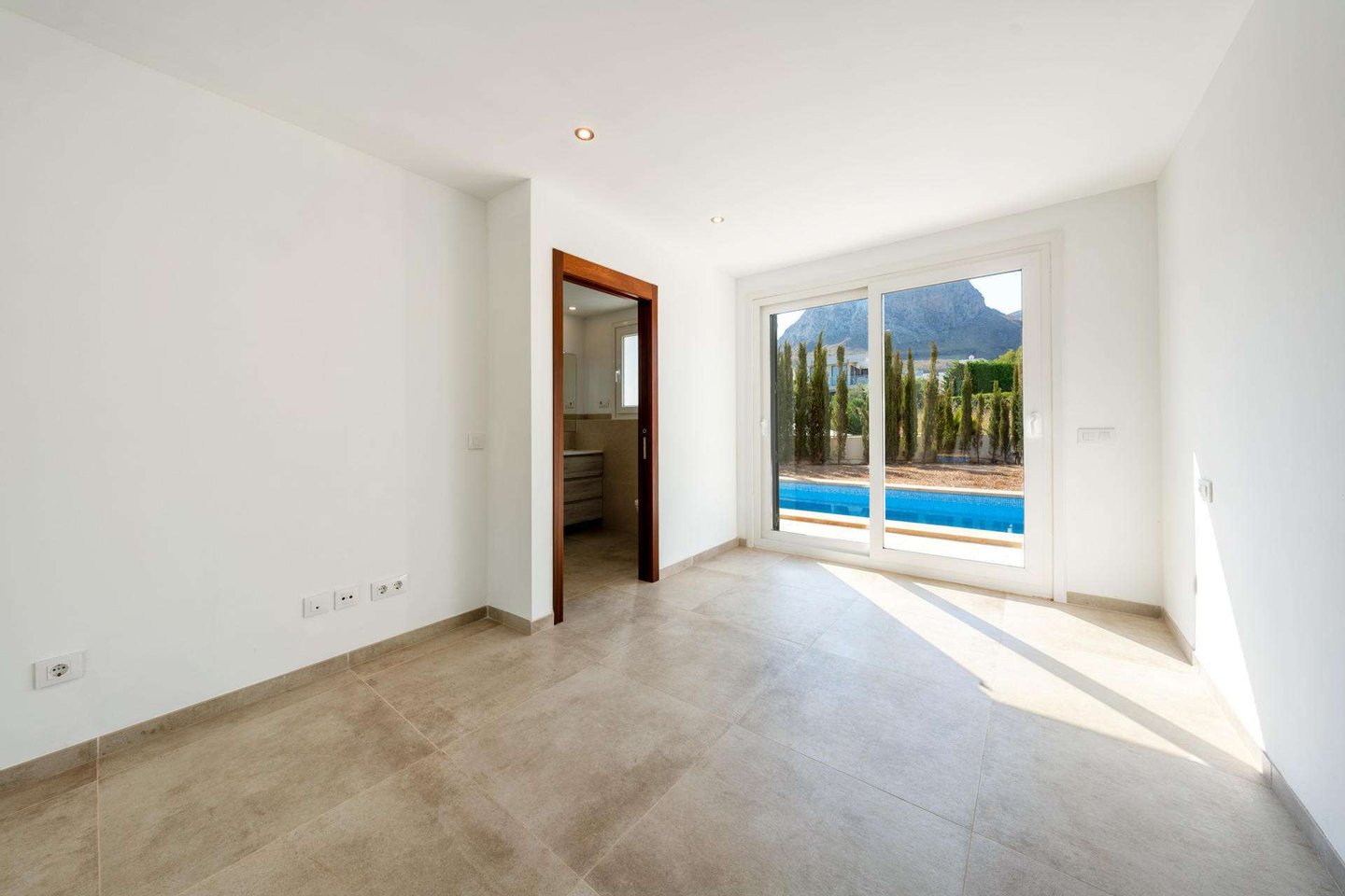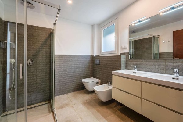 Auf dieser Etage befinden sich auch zwei Doppelschlafzimmer, beide mit eigenem Bad. Ausserdem sind die Zimmer mit Einbauschränken und eines davon auch mit einem Ankleidezimmer ausgestattet. Es gibt ebenfalls noch eine Gästetoilette, die direkt vom Poolbereich aus zugänglich ist.