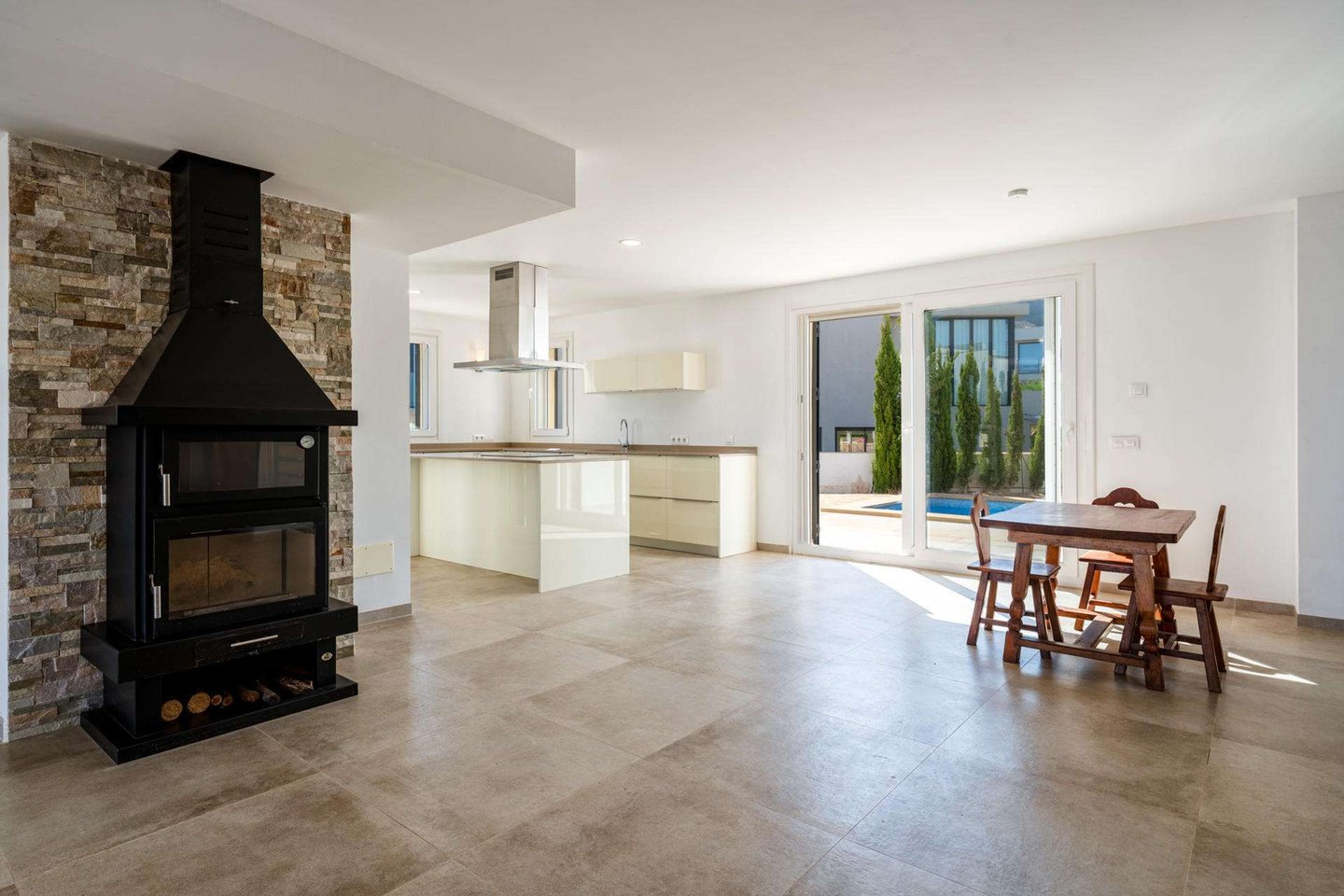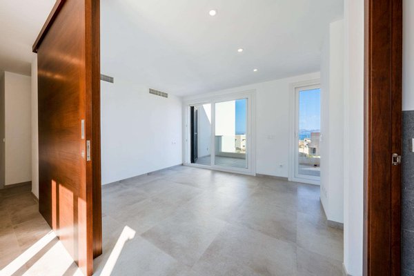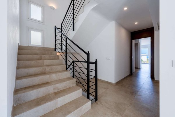 Im Erdgeschoss finden wir die Eingangshalle und das unglaublich geräumige und helle Wohnzimmer mit Kamin, das mit einer offenen Küche verbunden ist, in der man dank der großen Fenster nicht nur den Blick auf die Berge oder das Meer genießen kann, sondern auch Zugang zu einem bezaubernden Swimmingpool und einer kleinen vorderen Terrasse hat.