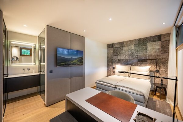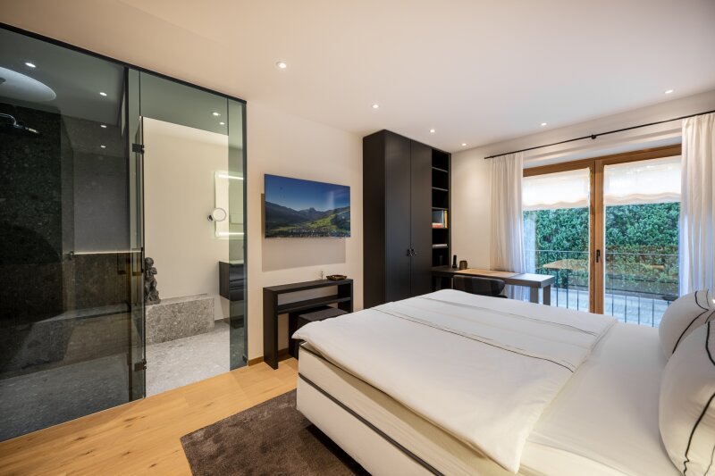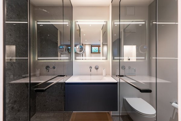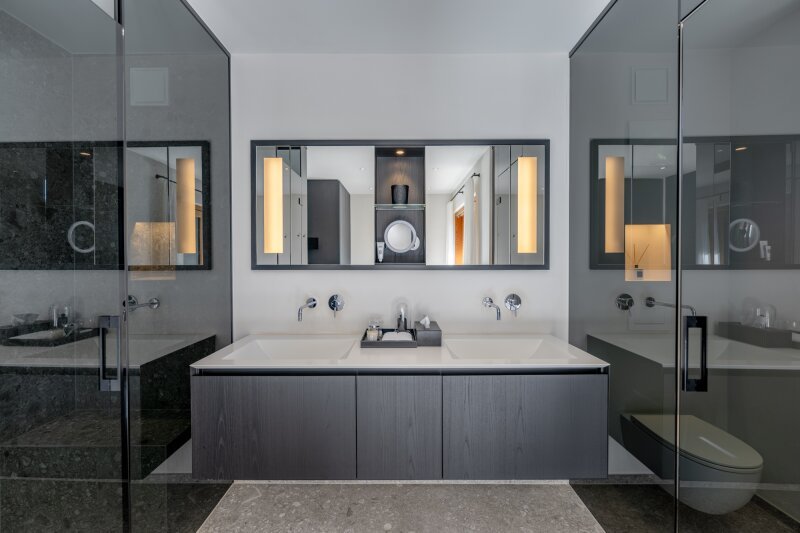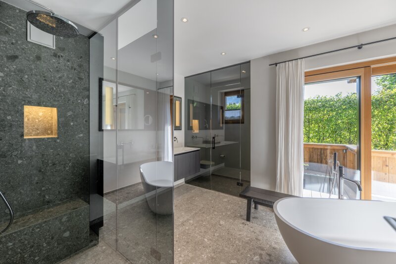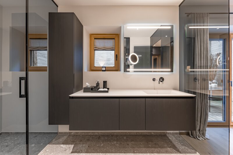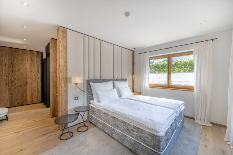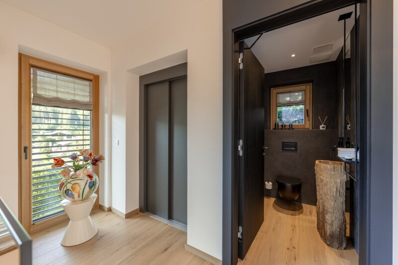 Die Erschließung erfolgt durch die leichte Hanglage im mittleren Geschoss, wo eine edel gestaltete Garderobe empfängt. Auf dieser Ebene ist die Eignersuite mit Ankleide und Badezimmer eingerichtet, ein weiteres Schlafzimmer samt Bad en suite und die Gästetoilette.