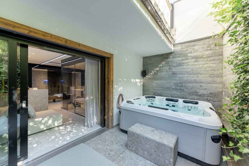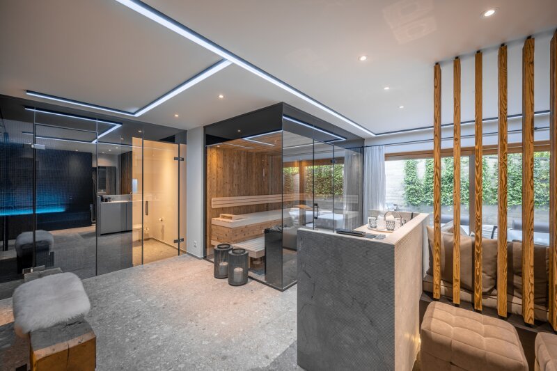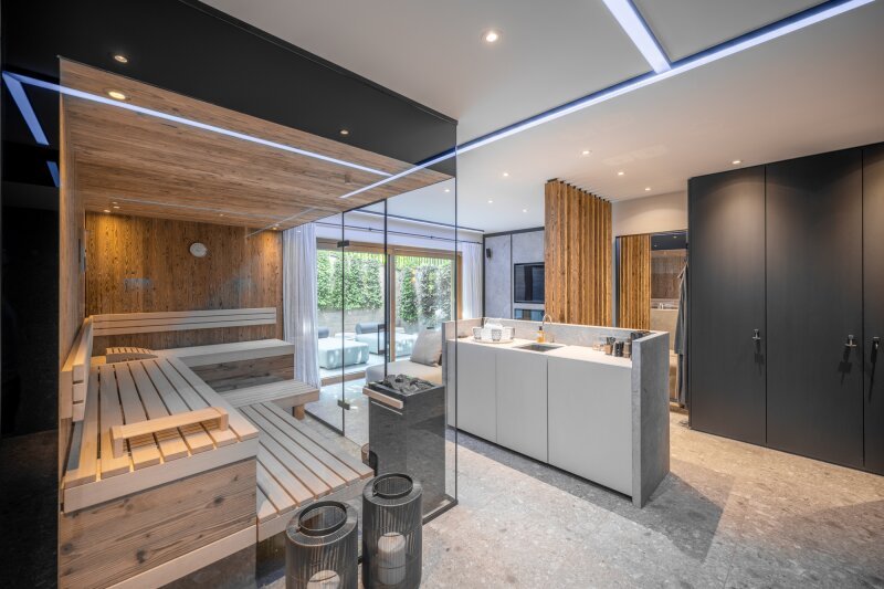 Das Untergeschoss bietet zwei weitere Schlafzimmer jeweils mit eigenem Bad, einen schicken Wellnessbereich mit Sauna, Dampfbad, Relaxzone sowie einen Whirlpool im breiten Lichthof davor. Weiters sind auf dieser Ebene ein praktischer Büroplatz untergebracht sowie Hauswirtschafts- und Technikräume.