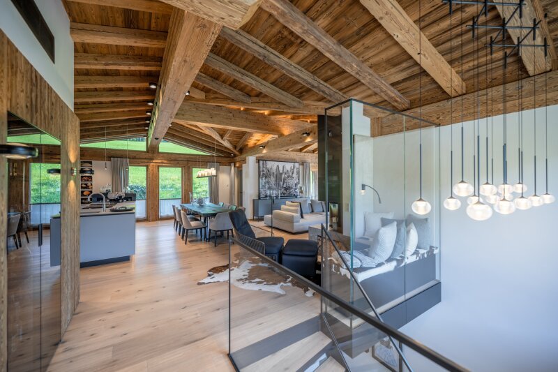 Herzstück ist das gesamte Obergeschoss, das von der Treppe beginnend Transparenz und Leichtigkeit vermittelt, durch den massiven Sichtdachstuhl aus Altholz und dem offenen Kamin mit behaglicher Gemütlichkeit äußerst gekonnt gemixt wird. Die Küche samt kleiner Speis ist umfassend ausgestattet, der große Esstisch teilt den Raum in Richtung Wohnlounge. Perfekt integriert sind die breiten, teils überdachten Terrassen Richtung Süd-Westen und Nord-Osten, die während der warmen Jahreszeit die Wohnebene erweitern.