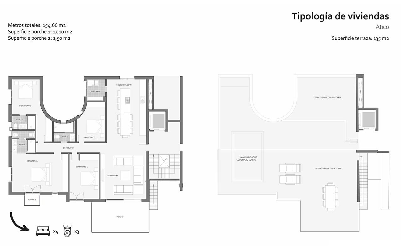 Diese fantastischen Penthouse-Wohnungen verfügen über eine konstruierte Fläche von 155 m² mit