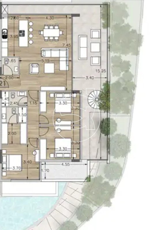 Diese Einheit verfügt über 2 Privatparkplätze und einen privaten Dachgarten von 65 Quadratmetern.