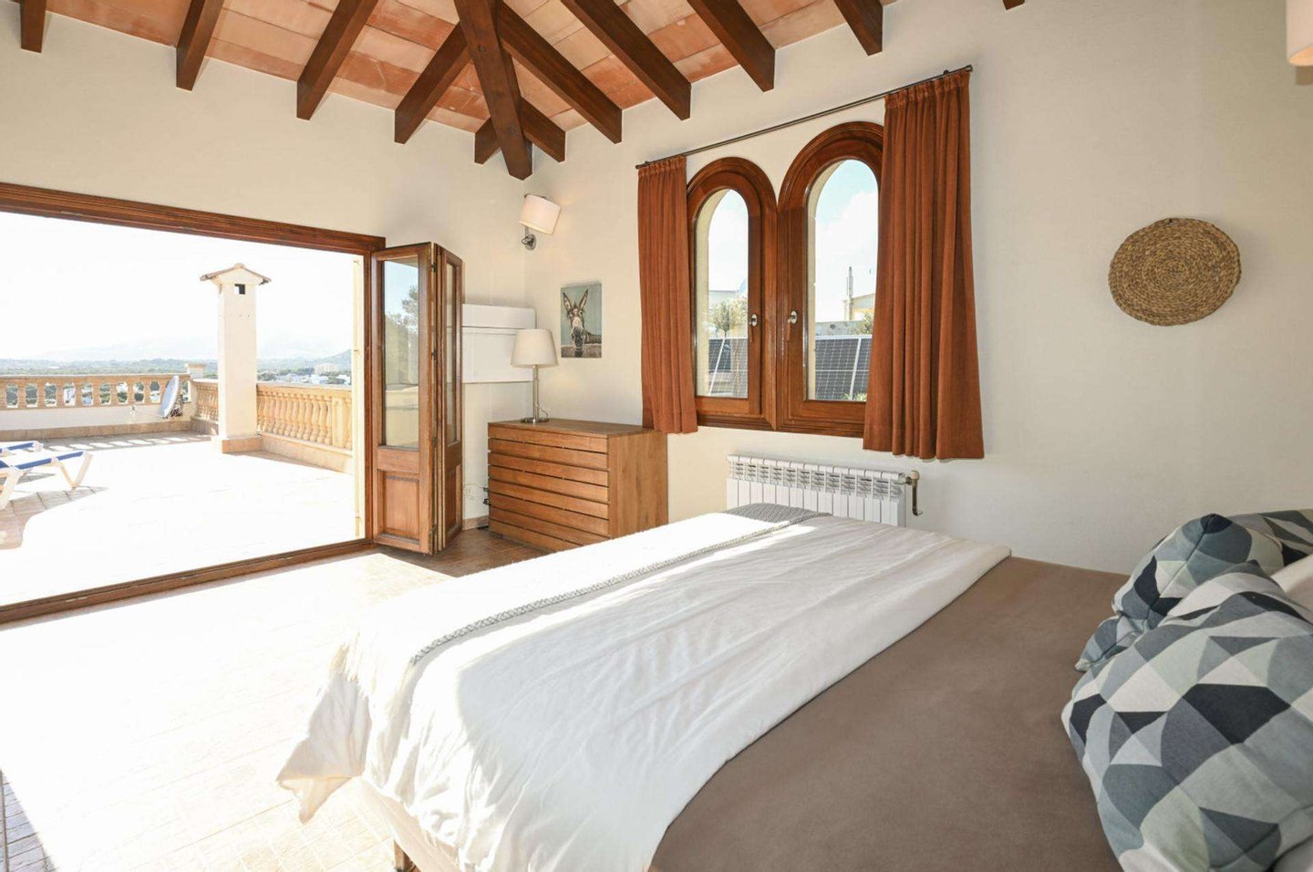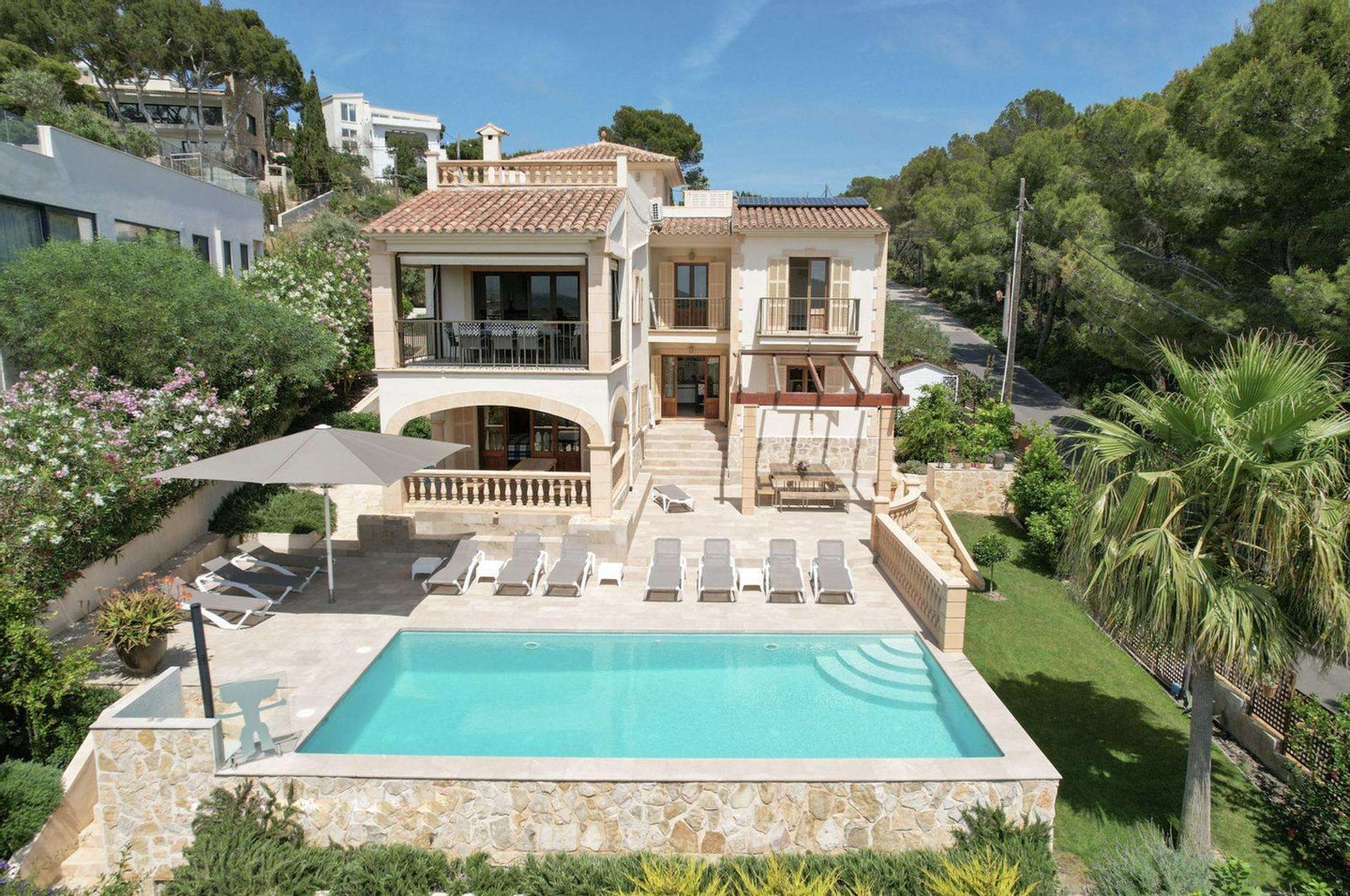 Die Nutzfläche von etwa 400 m2 erstreckt sich über drei Ebenen: Sie umfasst insgesamt sieben Schlafzimmer, vier Badezimmer (zwei davon en suite), einen offenen und geräumigen Wohnbereich mit erhöhtem Esszimmer sowie eine voll ausgestattete Küche, die Gäste und Familie gleichermaßen begeistert. Ein Höhepunkt des Hauses ist zweifellos das geschmackvoll eingerichtete Turmzimmer mit privater Dachterrasse und einem atemberaubenden Panoramablick.