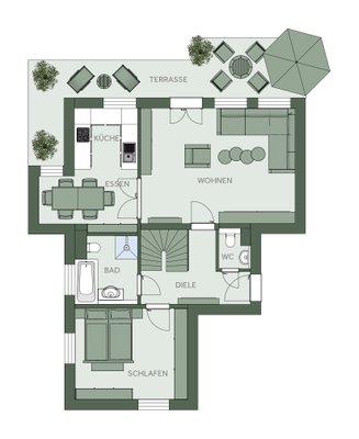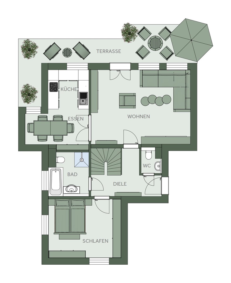 Die Wohnung überzeugt durch einen großzügigen Grundriss sowie eine sonnige Südterrasse mit eingewachsenem Gartenbereich, die vom hellen Wohnzimmer aus zugänglich ist. Die Wohnräume sind mit massivem Eichenparkett ausgestattet und bieten ein behagliches Wohnambiente. Die vorhandene Einbauküche, das Tageslichtbad sowie ein separates Gäste-WC bieten weiteren Komfort.