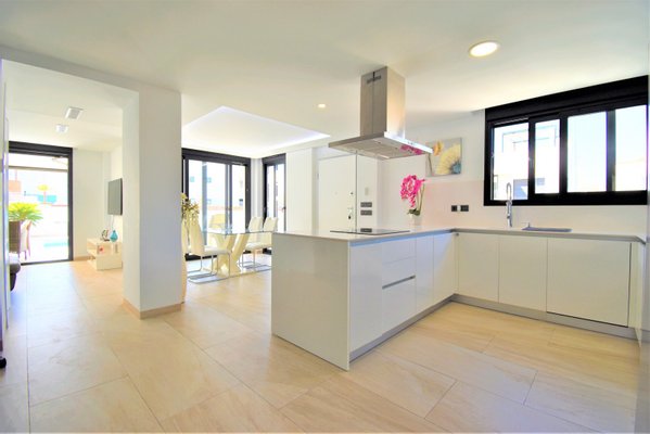 Diese nach Westen ausgerichtete, 2018 erbaute, freistehende Villa mit drei Schlafzimmern in Las Filipinas, einem beliebten Wohngebiet in Villamartin. Eine Vielzahl von Bars/Restaurants erreichen Sie in nur zehn Minuten zu Fuß. Der nächste Supermarkt einer großen Kette ist fünf Minuten mit dem Auto entfernt, außerdem gibt es drei Golfplätze, Villamartin Plaza und das Einkaufszentrum La Fuente. Das Einkaufszentrum La Zenia Boulevard erreichen Sie mit dem Auto in zehn Minuten und die Strände entlang der Küste in fünfzehn Minuten. Da diese Immobilie von einem renommierten Bauunternehmer gebaut wurde, sind die Qualitäten dieser Immobilie unübertroffen. Der Hauptwohnbereich ist offen gestaltet und verfügt über zwei breite Schiebetüren, eine vom Wohnzimmer und die andere vom Essbereich, die zum Poolbereich führen. Außerdem gibt es Treppen, die in die erste Etage und in das Untergeschoss führen. Die Küche ist komplett ausgestattet und es gibt ein Duschbad sowie ein Doppelzimmer mit eigenem Duschbad und einer Terrasse. Im ersten Stock gibt es ein weiteres Doppelzimmer mit Ankleideraum, eigenem Bad und Zugang zum Solarium. Das Untergeschoss besteht aus einem Wohn- und Küchenbereich sowie einem Doppelzimmer mit eigenem Bad, Doppelschiebetüren nach außen und einem Küchenbereich. Der Garten ist gefliest und verfügt über eine Kunstrasenfläche, einen privaten 7x4-Pool und Parkplätze abseits der Straße. Zu den Extras gehören eine Klimaanlage, elektrische Tore und Einbauschränke in den Schlafzimmern.