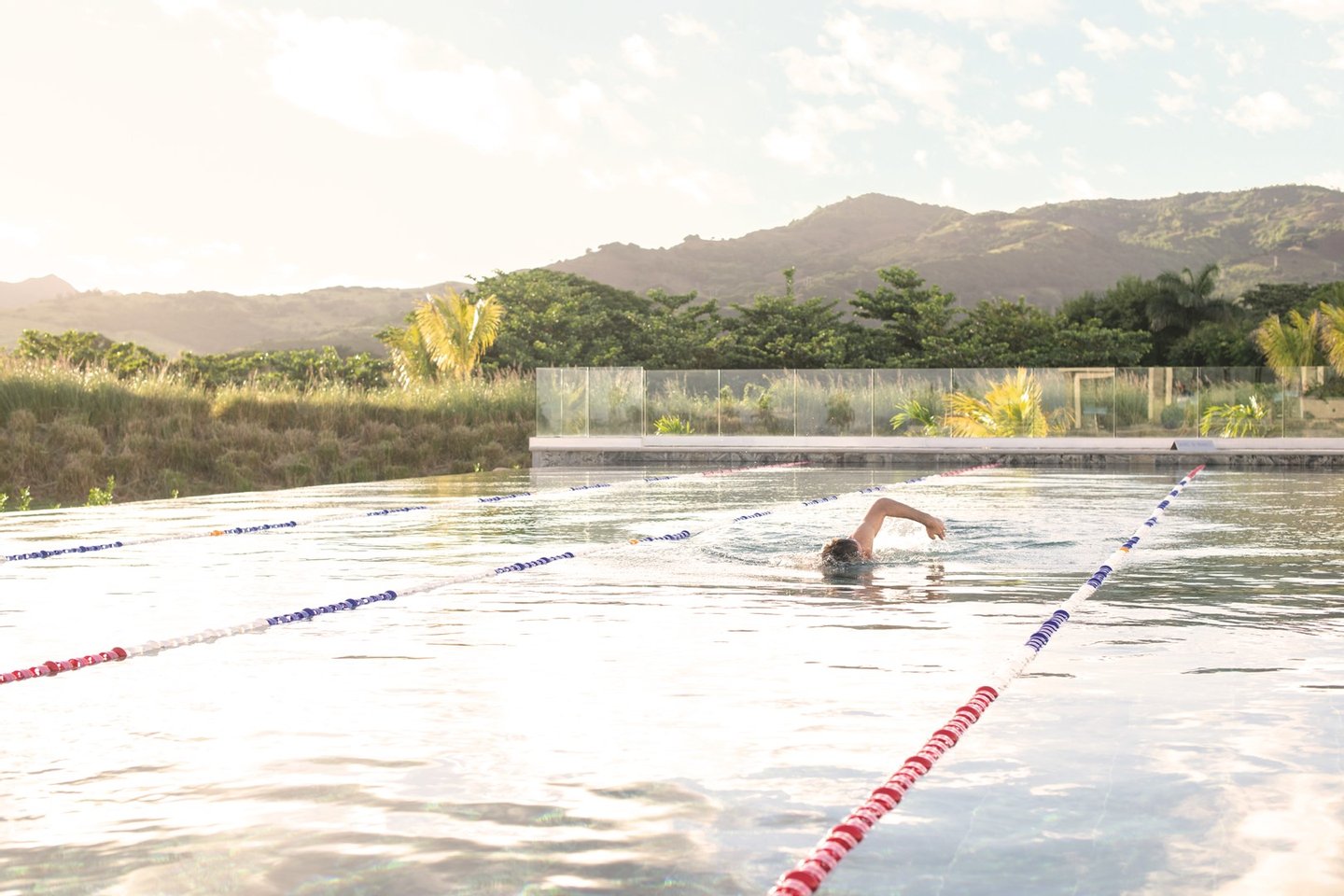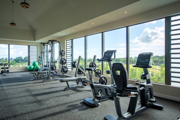 Ein Sportzentrum mit einem 25-m-Schwimmbecken, einem Fitnessstudio, einem Yoga-Bereich und Tennisplätzen.