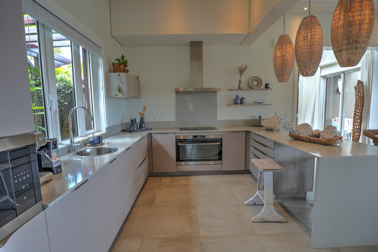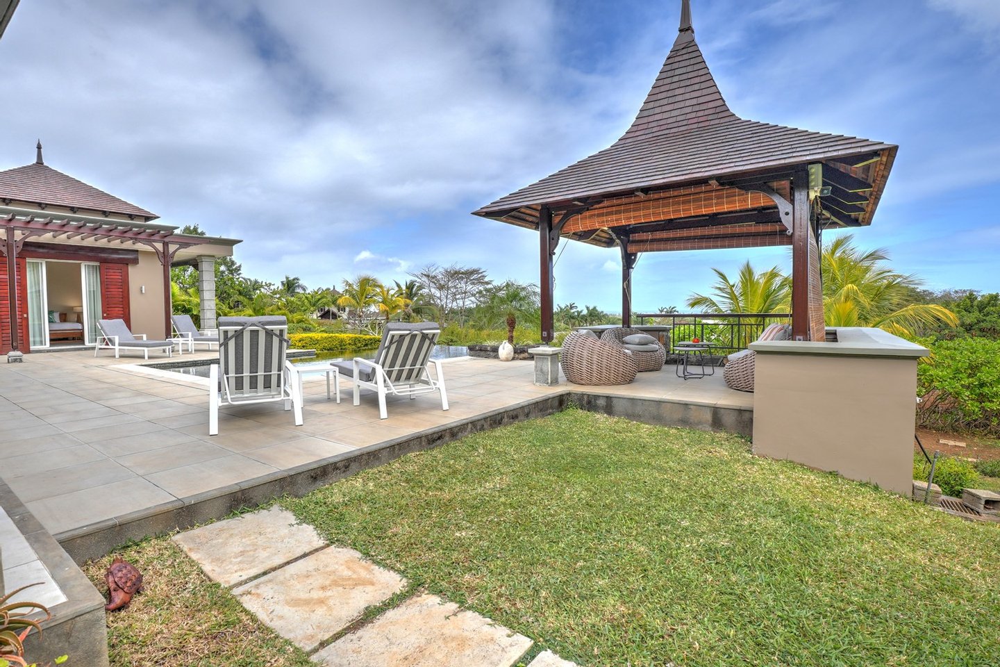 Die Veranda, eine wahre Oase der Entspannung, beherbergt einen Barbereich, während der Poolbereich bis zum Pavillon reicht und Sie zu einem unvergleichlichen Leben im Freien einlädt. Die voll ausgestattete amerikanische Küche schließt harmonisch an eine geräumige Spülküche an, die perfekt für die Erfüllung all Ihrer Bedürfnisse geeignet ist.