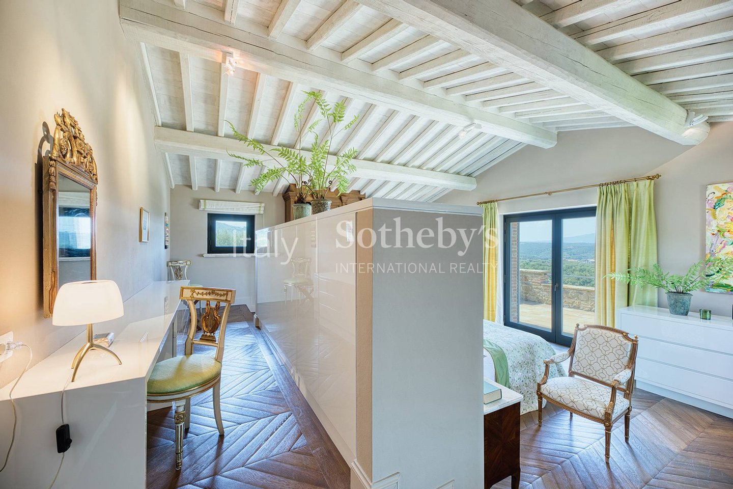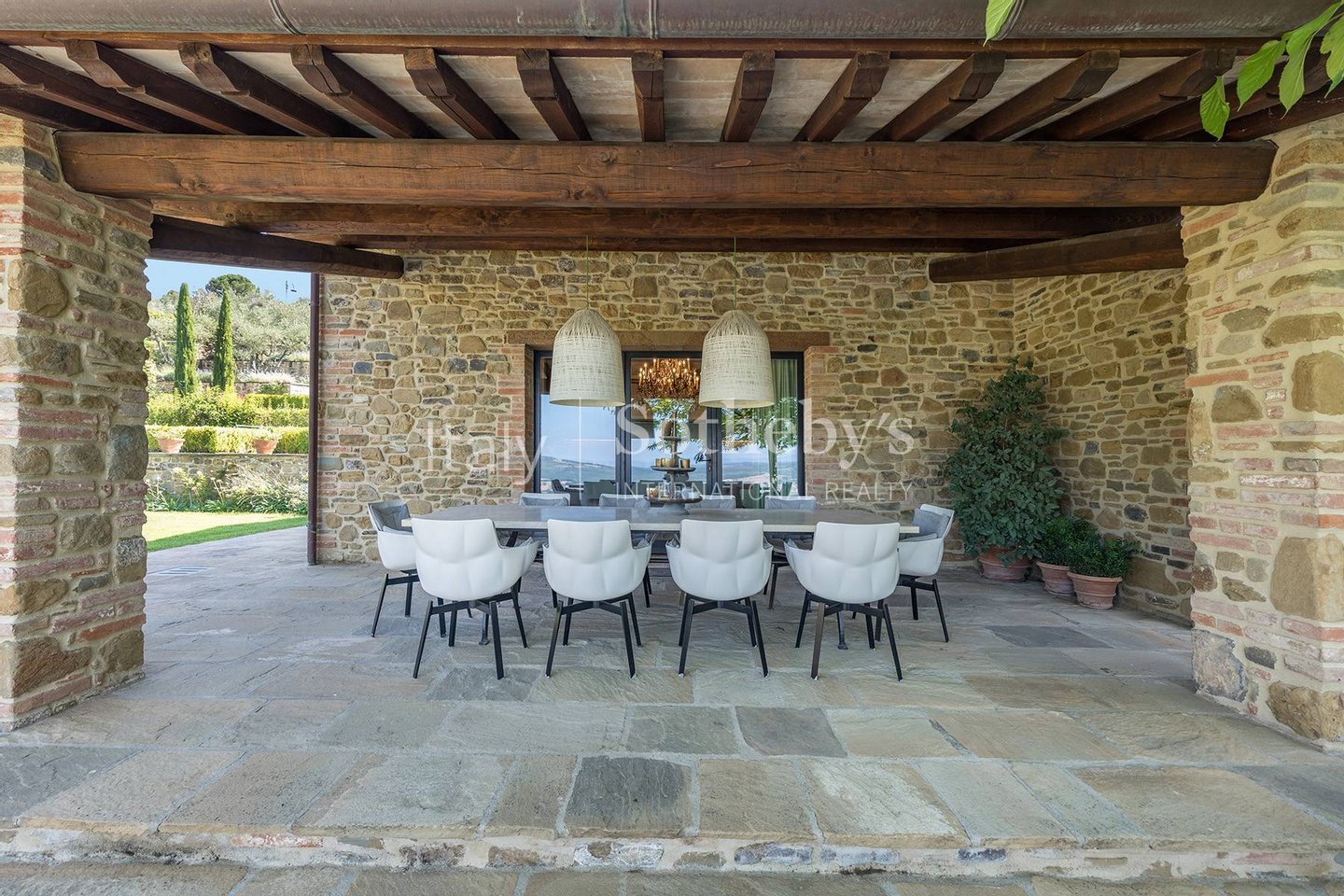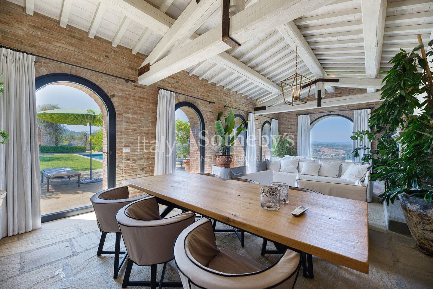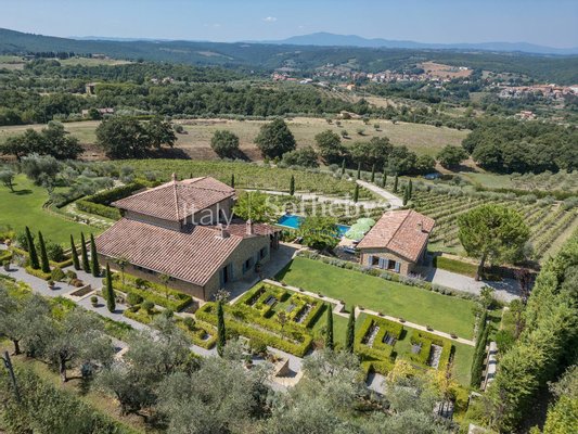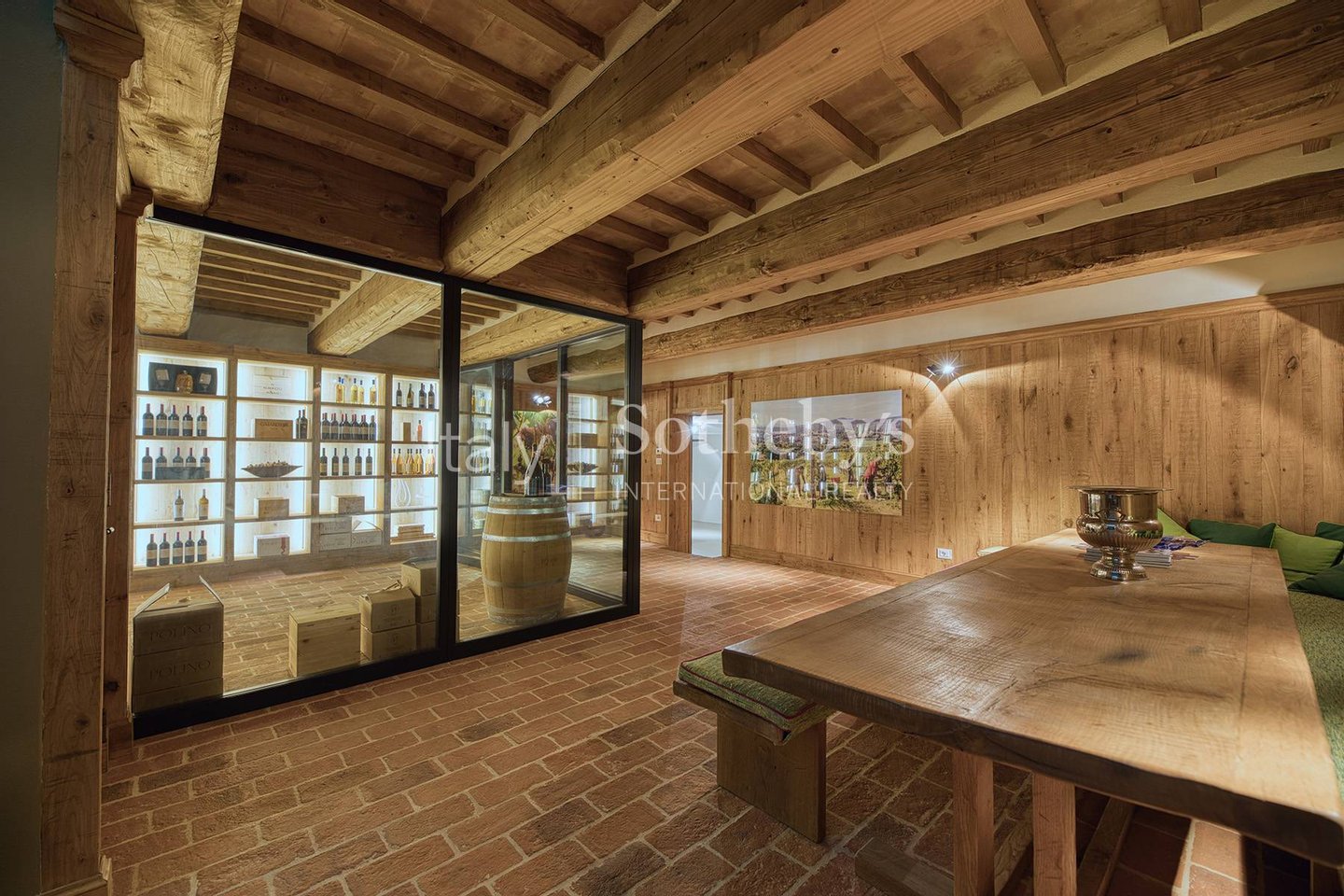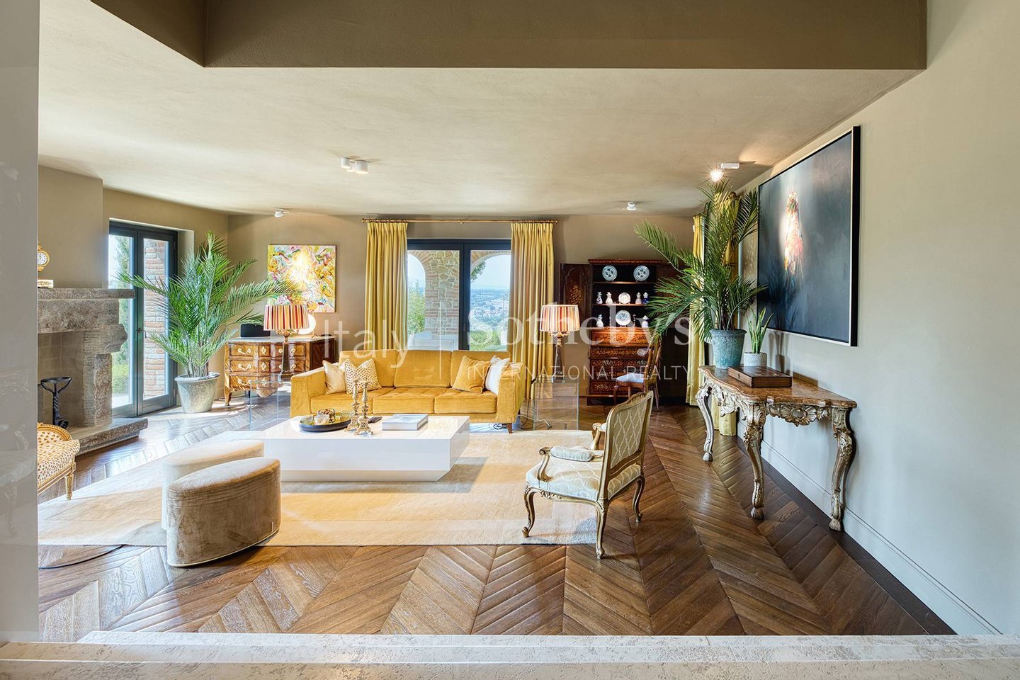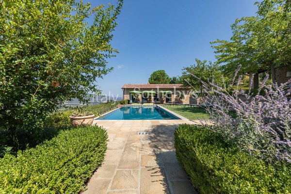 Das Anwesen erstreckt sich über 12 Hektar, davon 8 Hektar Weinberge, die 4000 Flaschen pro Jahr produzieren; mehr als 3 Hektar sind für die Ölproduktion reserviert, 5,5 Hektar sind Ackerland und etwa 2 Hektar sind Wald. Es gibt einen privaten Teich und ein 84 m² großes landwirtschaftliches Nebengebäude. Die 2016 erbaute Immobilie verfügt über eine hohe Energieeffizienzklasse (A1) und stellt die perfekte Kombination aus traditionellem Umbriens und Modernität dar, wie an den Möbeln, den verwendeten Technologien, der Fußbodenheizung/Kühlung, der Innenbeleuchtung und den verwendeten Materialien zu sehen ist: Stein für die Türrahmen und Travertin für die Böden. Das Haus zeichnet sich durch große, lichtdurchflutete Räume aus, mit großen Fenstern, die einen herrlichen Blick auf das Tal und das charakteristische Dorf Piegaro bieten.