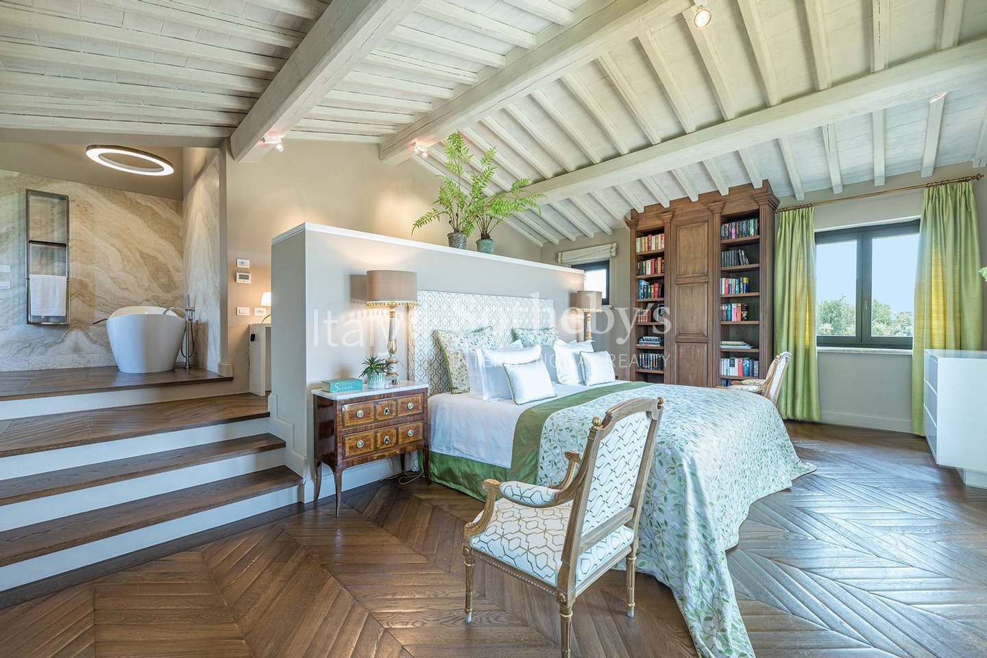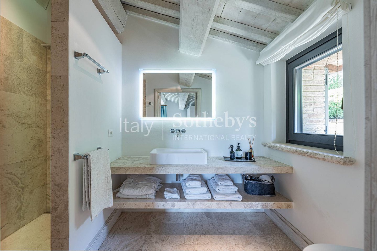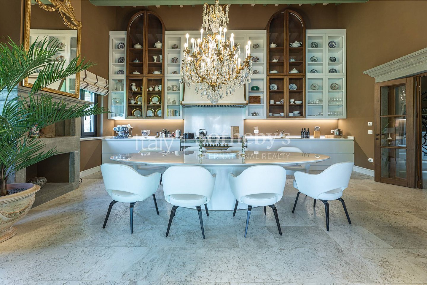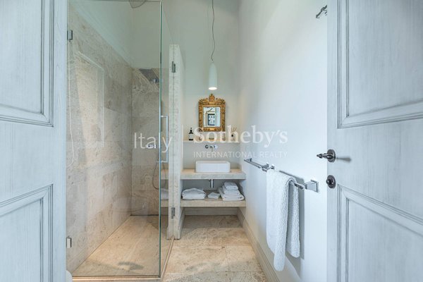 Im Außenbereich schaffen der italienische Garten und architektonische Details wie der Seerosenbecken und der Brunnen eine wirklich entspannende Atmosphäre. Der 12x6 Meter große Pool, der mit Sauerstoff gereinigt und beheizt wird, ist eine Oase der Entspannung mit atemberaubendem Blick. Zur Komplettierung des Anwesens bietet die Dependance ein großzügiges Open Space mit Kamin, Wohnbereich, Doppelbett, komplett ausgestatteter Küche und Bad, ideal für Gäste oder als Fitnessraum oder Atelier.