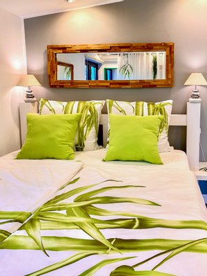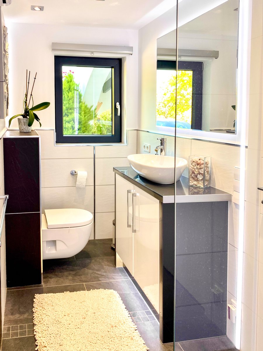 Entspannen Sie in einem der drei geräumigen Schlafzimmer, die jeweils über ein eigenes Bad verfügen. Eine separate Gästewohnung mit eigenem Eingang und Terrasse bietet die Möglichkeit zur Vermietung. Ein weiteres Zimmer kann als viertes Schlafzimmer genutzt werden.