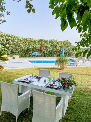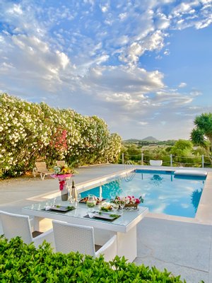 Der Außenbereich bezaubert mit einem herrlichen Garten voller exotischer Pflanzen und Obstbäumen wie Orangen-, Zitronen-, Feigen- und Mandelbäumen. Genießen Sie die überdachte Veranda mit atemberaubendem Panoramablick. Der 10 x 5 Meter große Swimmingpool lädt zum Entspannen ein.