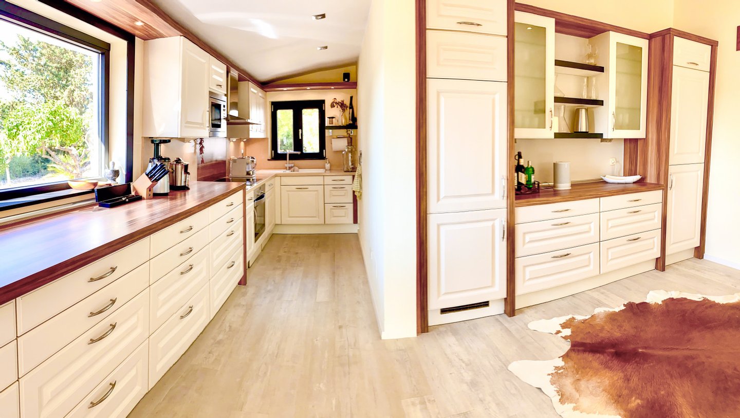 Das Wohnzimmer lädt mit einem hochwertigen Specksteinkamin zum Verweilen ein. Die Nolte-Küche lässt keine Wünsche offen. Das gesamte Haus verfügt über Fußbodenheizung und Klimaanlage.