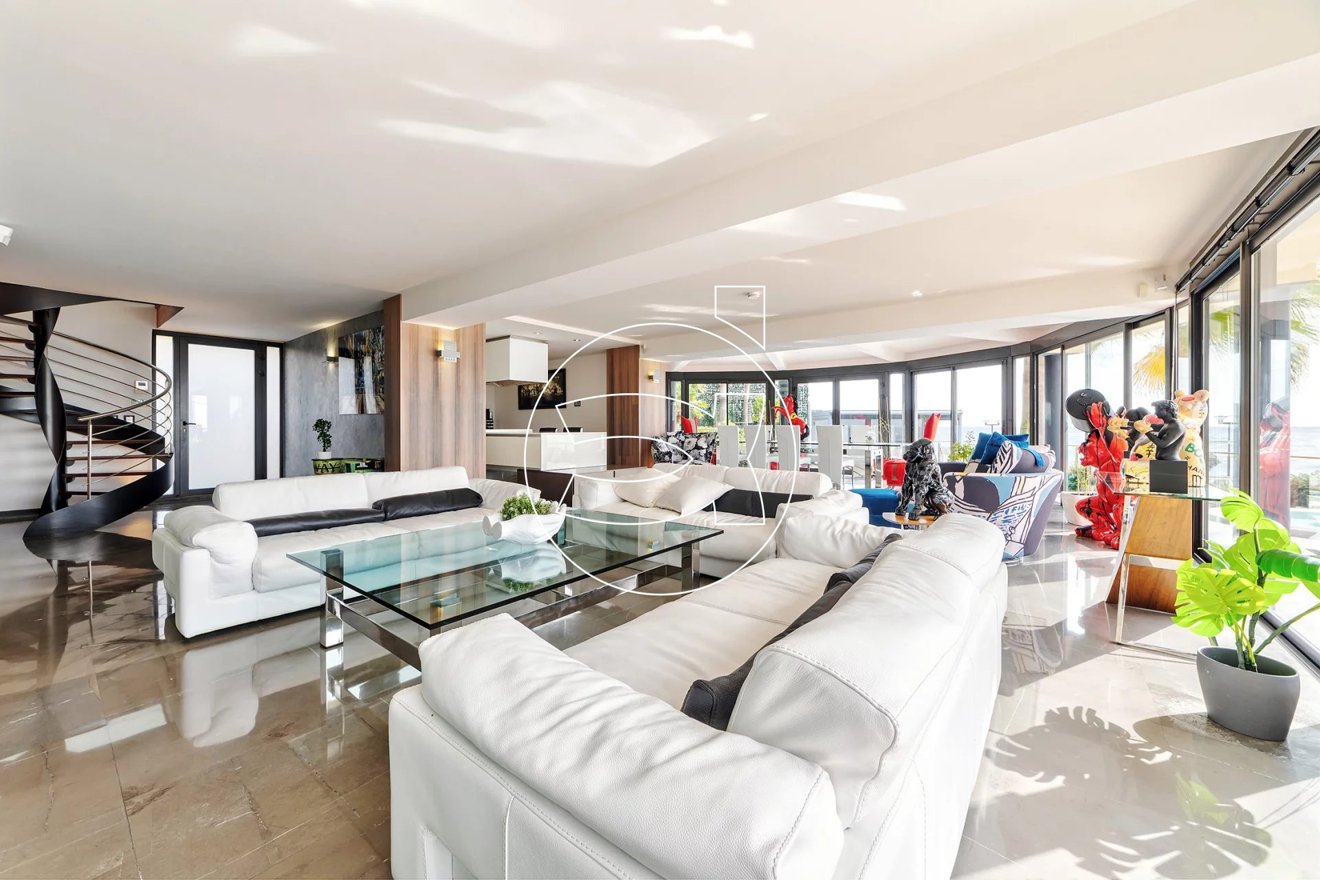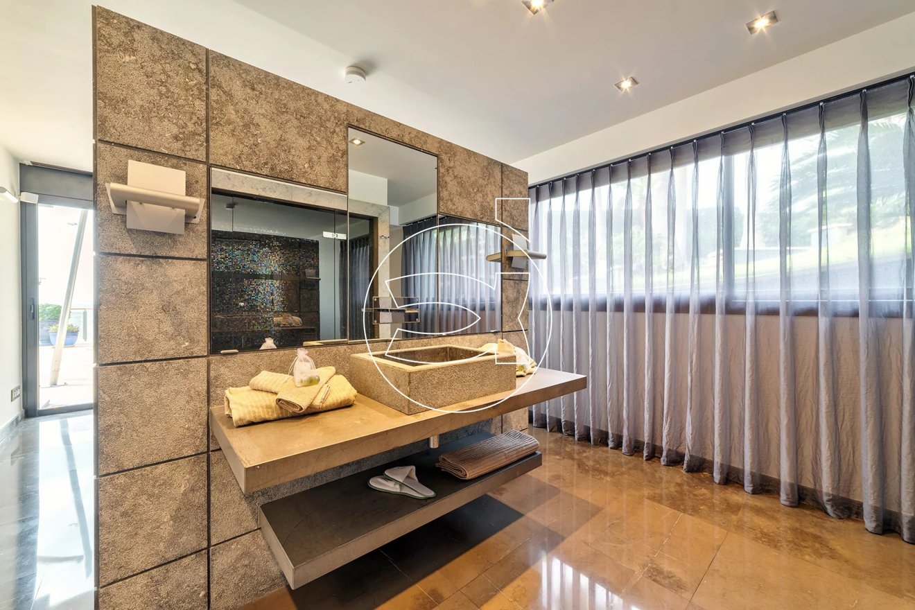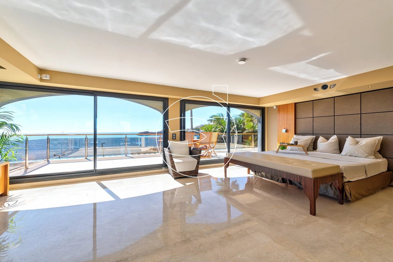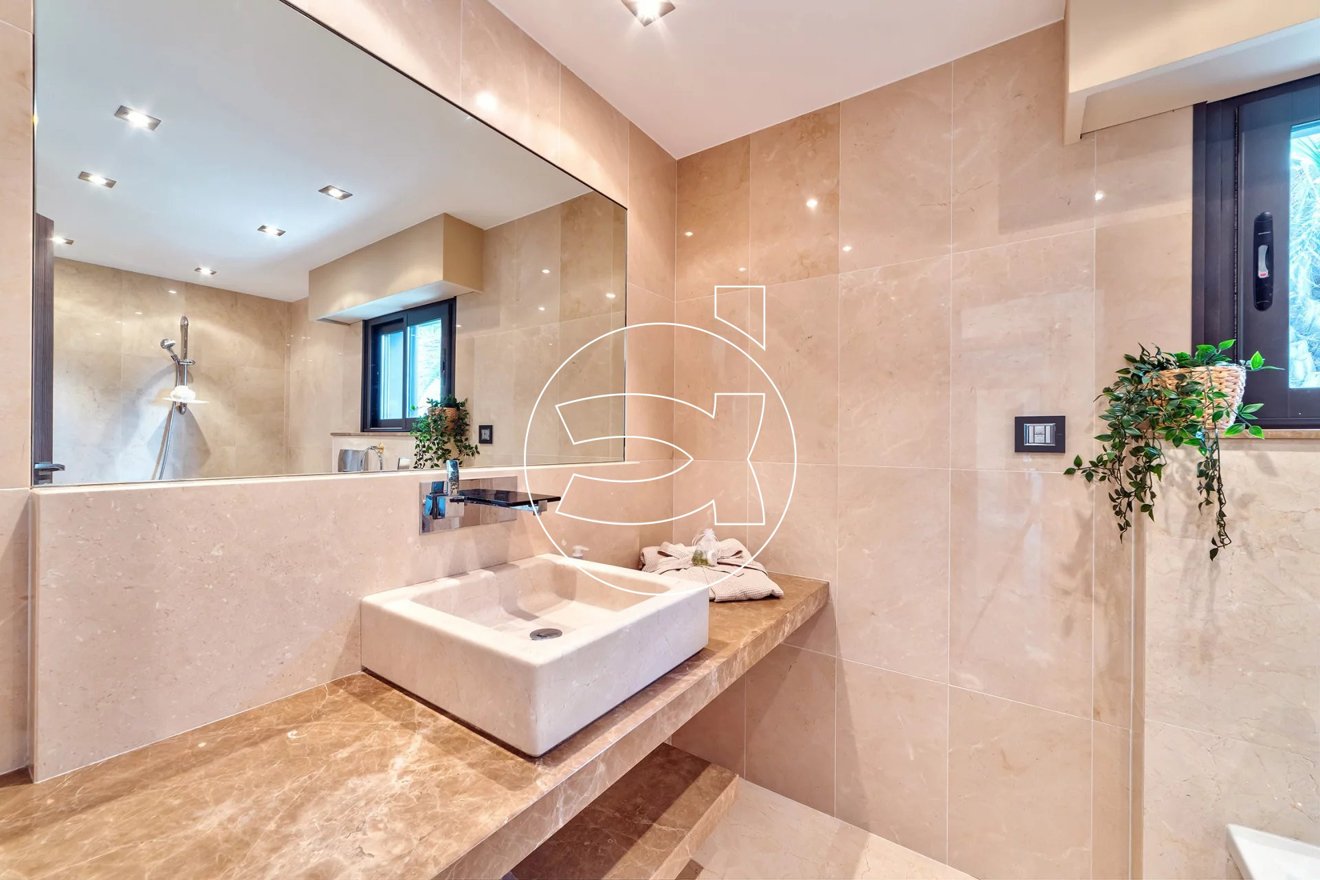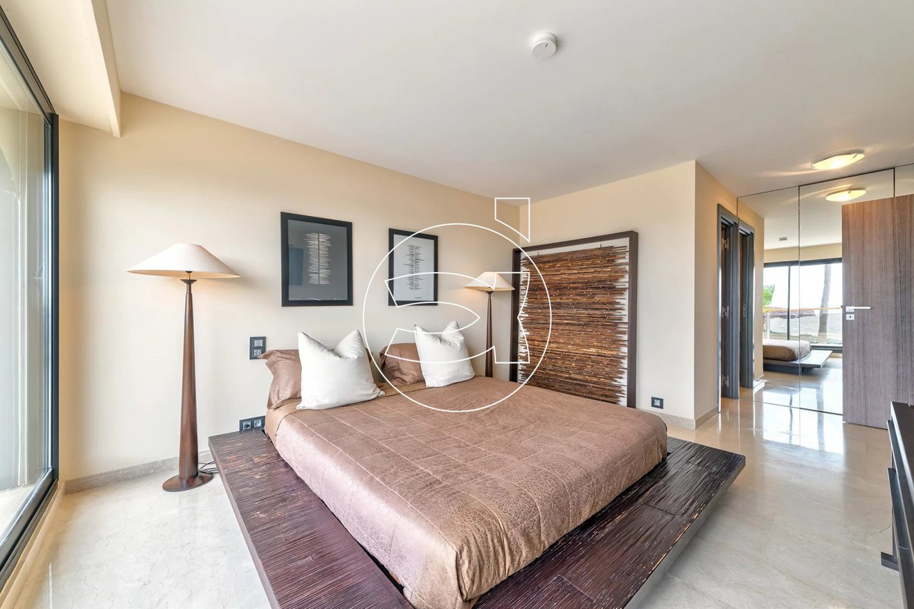 Die Terrasse, die an die Küche und das Wohnzimmer angrenzt, bietet großzügige Flächen und zwei große Essbereiche im Freien, perfekt, um das ganze Jahr über draußen zu speisen. Im Obergeschoss befinden sich zwei weitere Schlafzimmer, jedes mit eigenem Bad, WC und Ankleideraum. Beide Schlafzimmer haben Zugang zu einer großen Terrasse mit Meerblick.