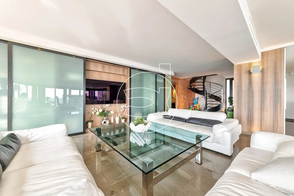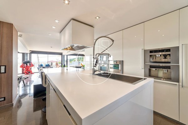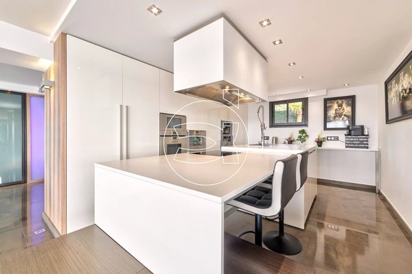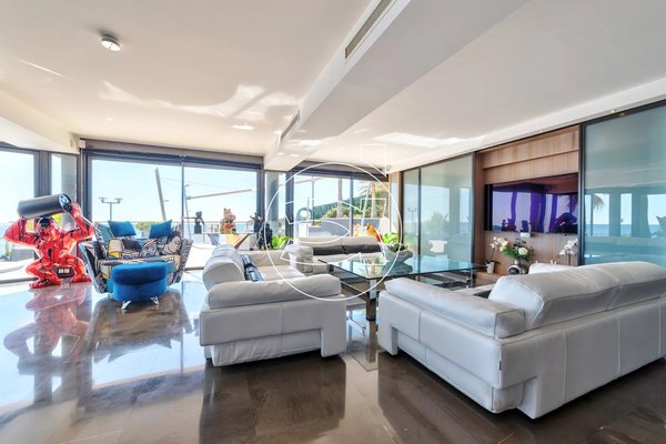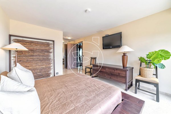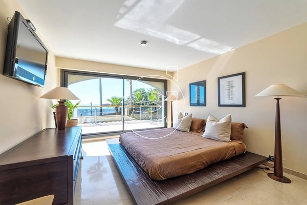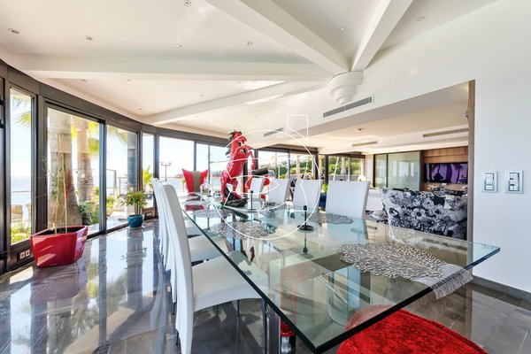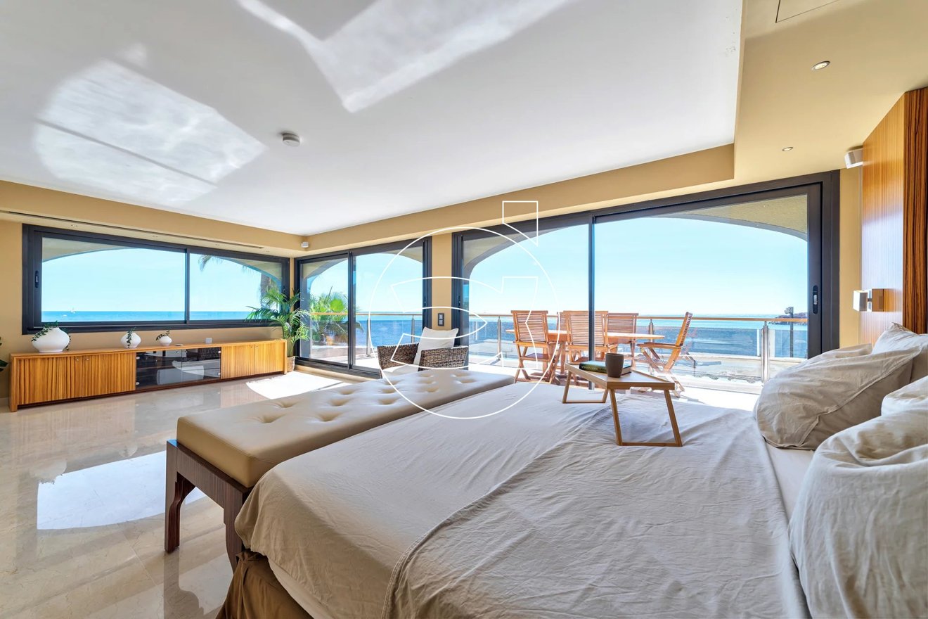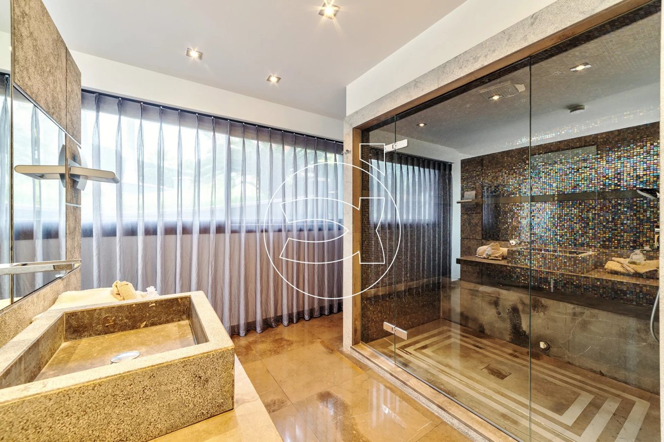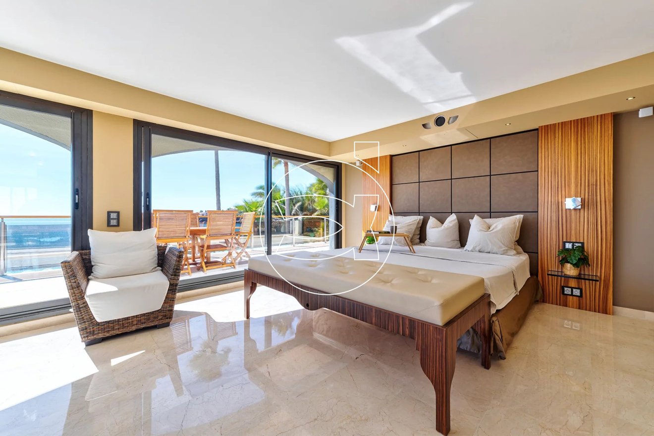 Die Terrasse, die an die Küche und das Wohnzimmer angrenzt, bietet großzügige Flächen und zwei große Essbereiche im Freien, perfekt, um das ganze Jahr über draußen zu speisen. Im Obergeschoss befinden sich zwei weitere Schlafzimmer, jedes mit eigenem Bad, WC und Ankleideraum. Beide Schlafzimmer haben Zugang zu einer großen Terrasse mit Meerblick.