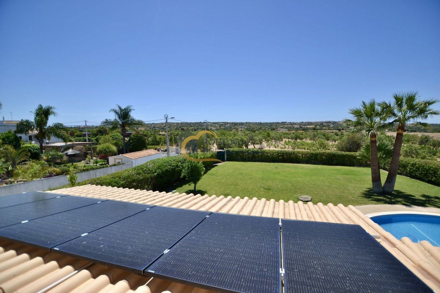 Große Terrasse mit Blick auf den Garten und den Pool.