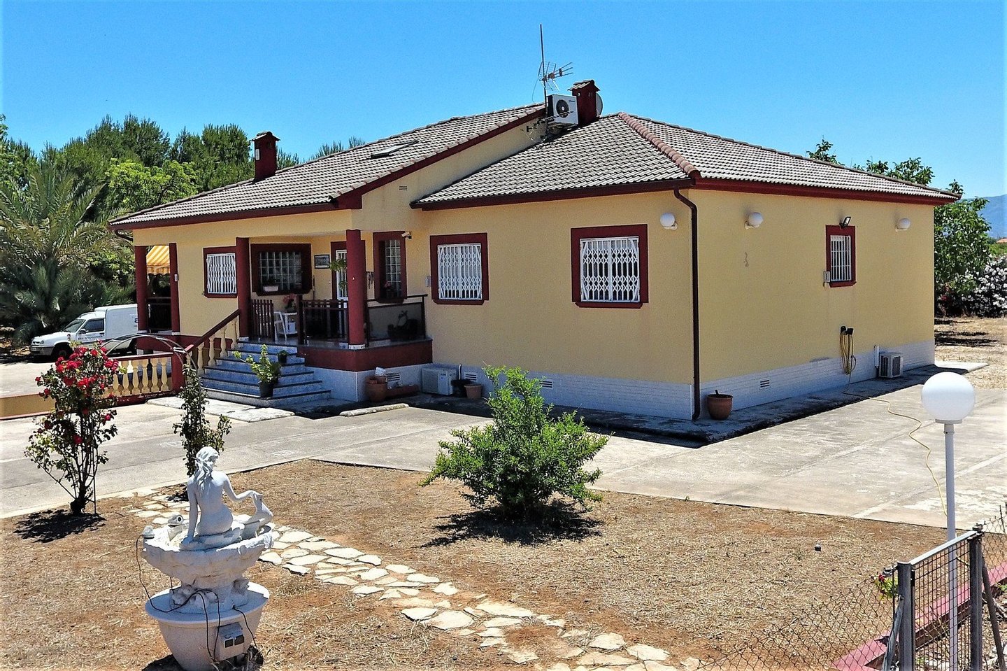 Dieses einstöckige Haus gliedert sich in 4 Doppelzimmer, 1 Duschbad und 1 Badezimmer auf. Beim Eintreten in den Flur befinden sich die Schlafzimmer auf der rechten Seite, die eingerichtete unabhängige Küche mit Waschküche auf der linken Seite und das große Wohnzimmer mit Kamin direkt an der Vorderseite. Die Küche ist groß genug mit einem Essbereich, Zugang zur überdachten Terrasse durch die Waschküche. Die Wohnstube hat viel Platz und wenn Sie die Glastüren öffnen, haben Sie Zugang zur geschlossenen Terrasse mit Klimaanlage. Von hier aus können Sie nach draußen gehen und auf eine weitere offene Terrasse gelangen. Von innen, von der Halle aus, kann man bis zum Dachboden gehen, der zusätzlichen Platz für Spielzimmer, Büro, Gästeunterbringung und Lager anbietet. Wenn Sie nach unten gehen, haben Sie auch Zutritt zur Garage mit viel Platz für mehrere PKW´ s und viel Stauraum. Um das Grundstück zu betreten, durchfahren Sie ein elektrisches Tor und dann ein zweites, um zu einem offenen Bereich mit einem Carport für 3 Fahrzeuge und dem Garagentor zur Tiefgarage zu gelangen. Der Poolbereich, neben dem Haupthaus, hat eine große Terrasse, Grill und eine große geschlossene Komplettküche mit Essbereich, einem Duschraum und Abstellraum. Dank der großen Markisen können Sie die Außenterrasse im Schatten genießen. Das Haus ist geräumig, der Pool ist groß, es hat eine wunderbare Außen Küche mit Terrasse, um das Leben im Freien zu genießen, reichlich Parkplätze sind vorhanden. Es ist einzigartig, kommen Sie und sehen Sie es sich selbst an.