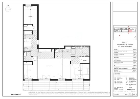 Sie verfügt über 3 Schlafzimmer, 2 Ankleidezimmer, 3 Badezimmer, eine offene Küche, 1 Wohnzimmer, 1 separate Toilette, 1 Waschraum, 1 Terrasse von 14 m2 sowie über einen Balkon von 28 m2.
