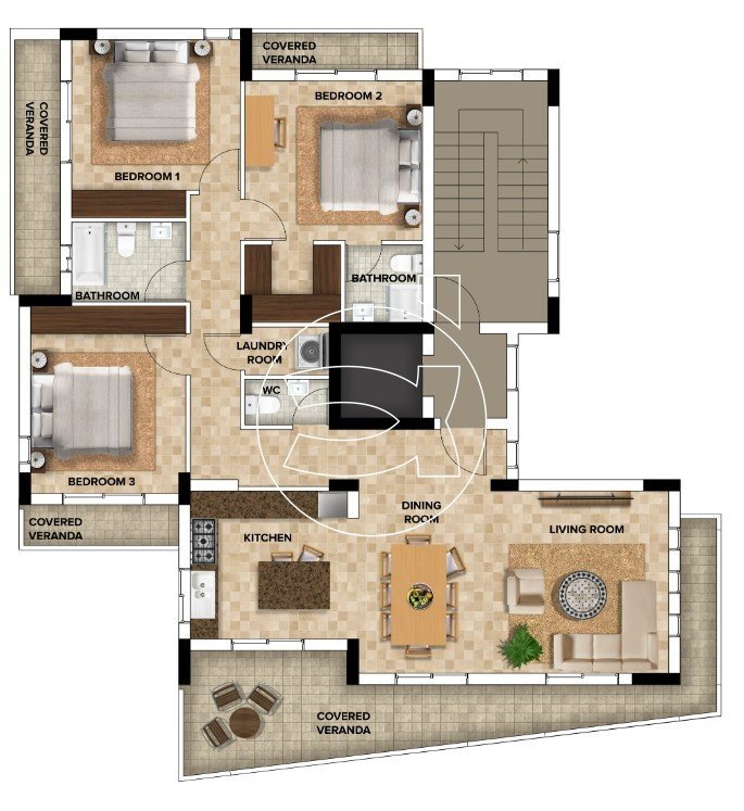 Geräumige Wohnung mit drei Schlafzimmern, einer separaten Waschküche, großen Balkonen und Stauraum.