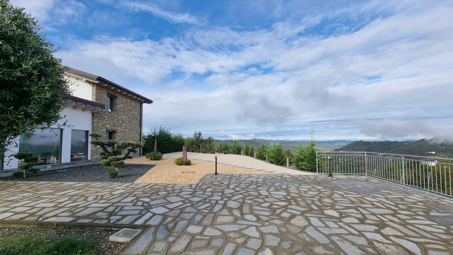Introducing an exceptional luxury estate set in 3.6 hectares of land and carefully manicured gardens and offering breathtaking panoramic views. Accessed via a short private driveway, this magnificent property seamlessly blends modern architectural elegance with the timeless charm of traditional stone houses typical of the region.Thoughtfully designed and impeccably furnished with contemporary designer pieces, this fully furnished villa extends over two large floors, in addition to an expansive basement.As you enter the ground floor, you are greeted by an impressive grand hall. The right wing features a bright, open-plan kitchen with French doors opening onto two Zen gardens and a sophisticated living room with an open staircase. The left wing offers two beautifully appointed bedrooms, a smaller room and a luxurious family bathroom.On the first floor is the master suite, accessed via a private staircase and featuring an elegant en-suite bathroom, spacious walk-in closet, private terrace and additional storage space. On the opposite wing of the property on the first floor is a guest bedroom with en-suite bathroom, offering the ultimate in privacy and comfort.The expansive basement offers practical convenience with a fully equipped laundry room, boiler room, ample storage space, wine cellar and a three-car garage