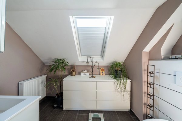 Zurück im Haus betreten Sie das 1. OG über die Echtholztreppe. Im 1. OG befinden sich zwei Schlafzimmer und ein großes frisch renoviertes Badezimmer mit Dusche und Badewanne.