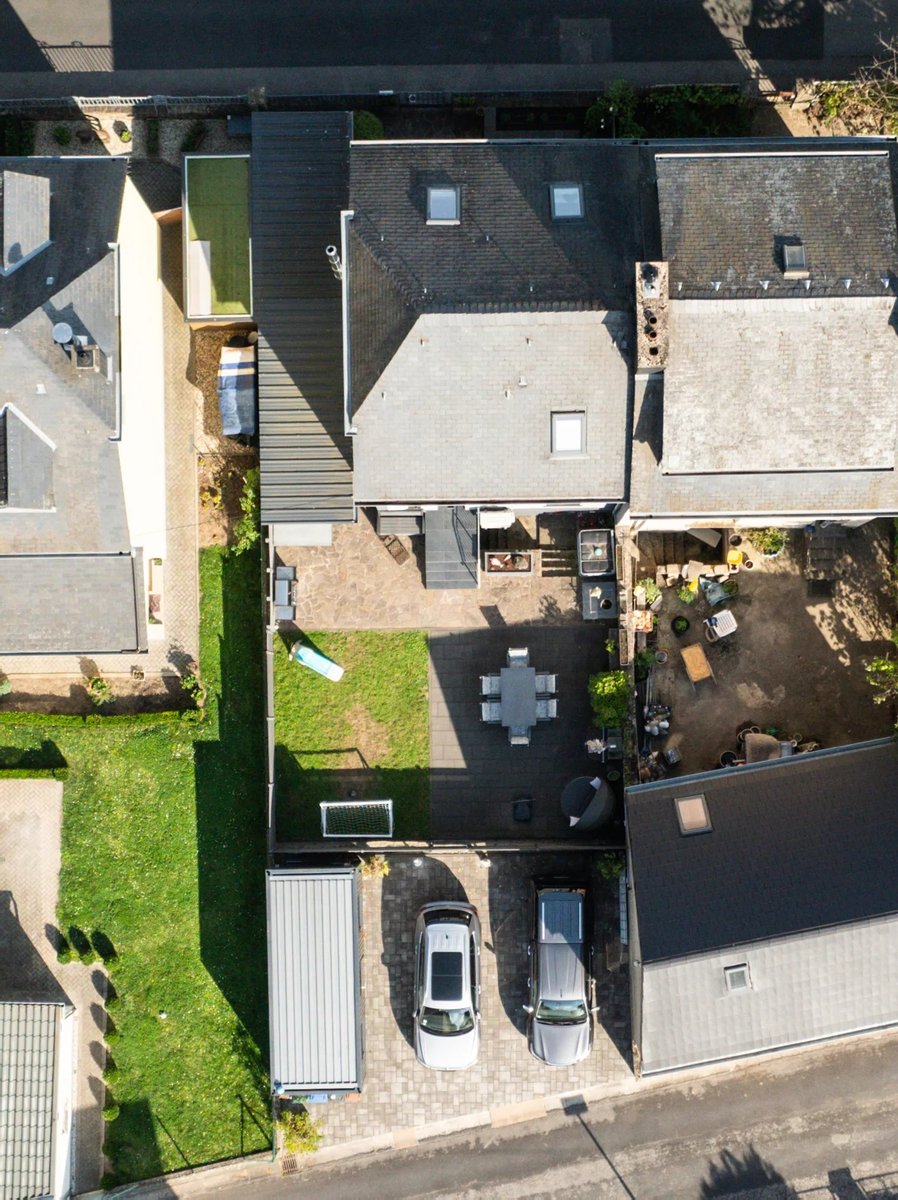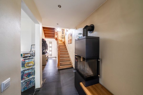 Das moderne und helle Design der Küche ermöglicht Ihnen, Ihre Kochkünste voll auszuleben. Angrenzend an die Küche befindet sich das Wohnzimmer mit Essbereich. Ein besonderes Highlight des Hauses ist der gemütliche Kamin im Flur gegenüber, der an kühlen Tagen für wohlige Wärme sorgt. Ein separates Gäste- WC befindet sich nebenan. Durch den Hinterausgang gelangen Sie in den schönen Garten und zur angrenzenden Terrasse. Dahinter befinden sich drei Außenstellplätze.