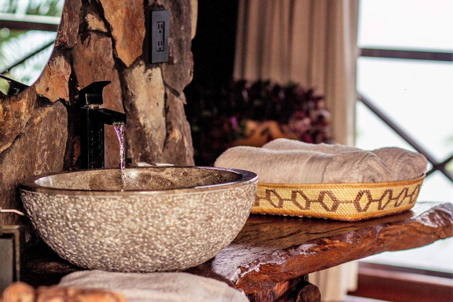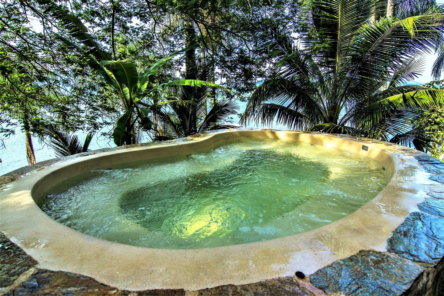 Poolbereich, umgeben von einer Terrasse, einem in einheimische Steine gehauenen Ziersee, der dem Ort einen zusätzlichen Charme verleiht. Im Solarium befindet sich ein luxuriöser Whirlpool mit herrlichem Blick auf das Meer und den Privatstrand.