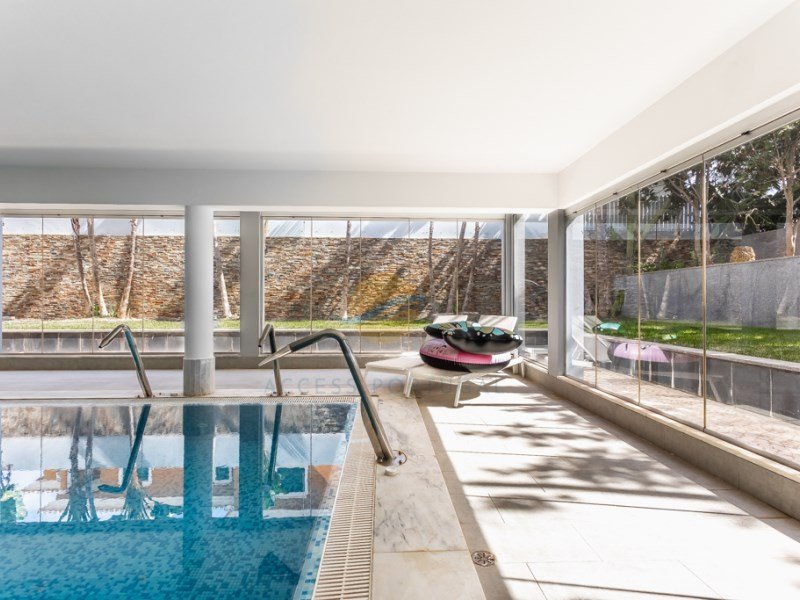 Das Untergeschoss beherbergt einen beheizten Innenpool, der von Schiebetüren aus Glas umgeben ist, die sich zum Garten öffnen und so eine perfekte Harmonie zwischen Innen- und Außenräumen schaffen. Ein Sauna- und Fitnessraum/Spielflur bieten alle Annehmlichkeiten für Entspannung und Spaß.