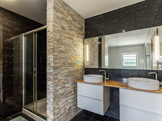 Eine halbe Etage tiefer finden wir vier geräumige Schlafzimmer mit Einbauschränken, die alle Zugang zu einer gemeinsamen Terrasse und zwei modernen Badezimmern haben, die Komfort und Privatsphäre für die ganze Familie bieten.