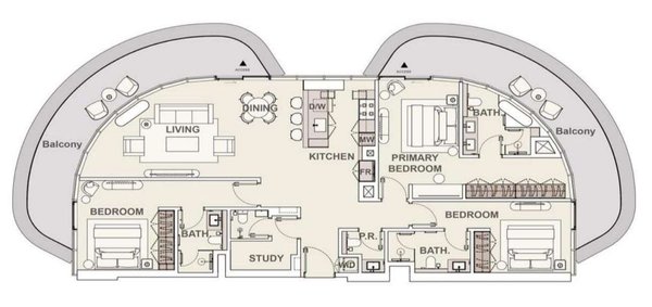 Sie betreten die geräumige 3 Bedroom Wohnung und werden sofort von den eleganten Holz Applikationen in den Räumen begrüßt. Die großen raumhohen Fenster lassen viel Licht herein und schaffen eine luftige Atmosphäre. In den Bädern sorgen die edlen
