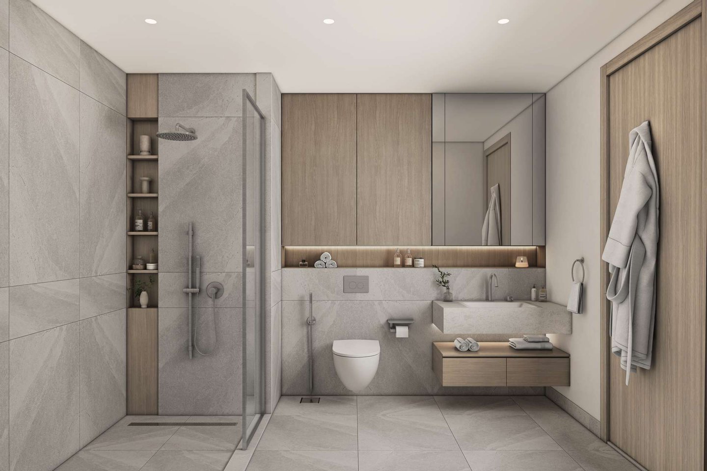 Sie betreten die geräumige 3 Bedroom Wohnung und werden sofort von den eleganten Holz Applikationen in den Räumen begrüßt. Die großen raumhohen Fenster lassen viel Licht herein und schaffen eine luftige Atmosphäre. In den Bädern sorgen die edlen Glasabtrennungen für ein modernes und stilvolles Ambiente.
