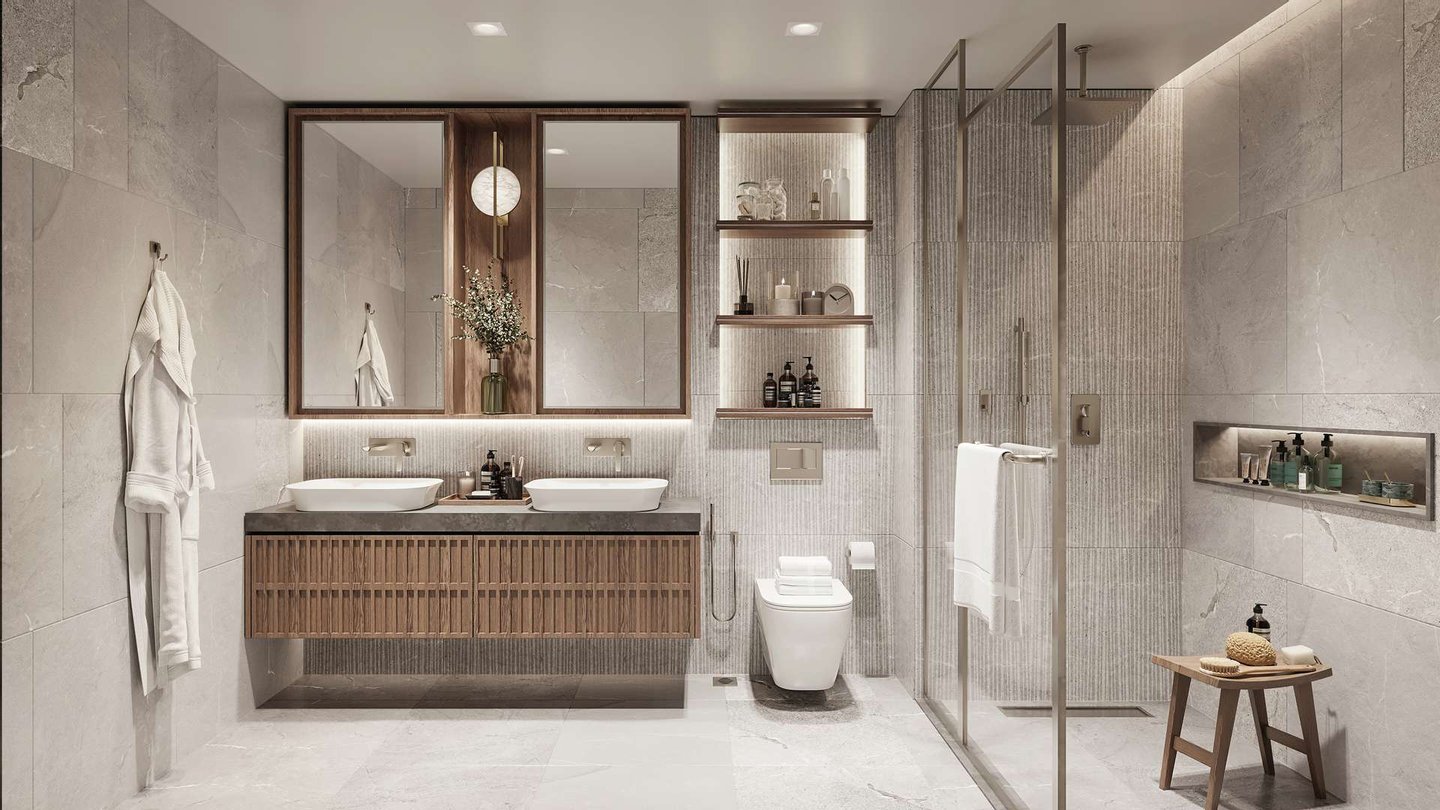 In den Bädern erwarten Sie Bodenfliesen aus Porzellan mit einer hellen Marmorader in einem versetzten Muster, während die Wandfliesen aus Porzellan mit einer gerippten Textur an den Akzentwänden für eine luxuriöse Atmosphäre sorgen. Tauchen Sie ein in die Welt des exklusiven Wohnens und lassen Sie sich von den hochwertigen Ausstattungsmerkmalen dieser Immobilie beeindrucken.