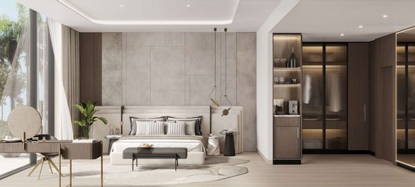 Die elegant gestaltete, raumhohe Eingangstür mit feststehenden Paneelen darüber gibt den Blick frei auf die Schlafzimmer, die jeweils über ein eigenes Bad und hochwertige, voll ausgestattete begehbare Kleiderschränke verfügen.