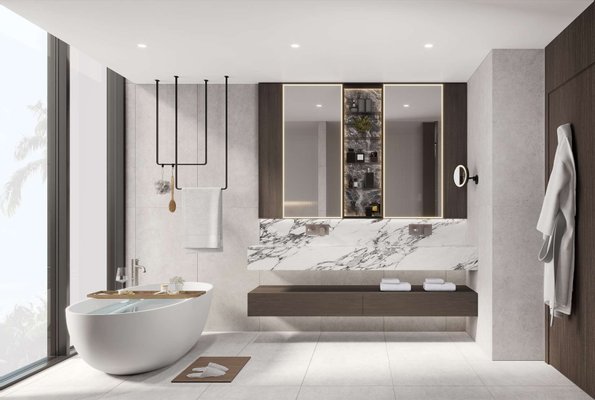 Ein Vollglasfenster im Hauptbad bietet einen Blick auf den Außenbereich und lässt natürliches Licht in das gesamte Badezimmer strömen. Die hochwertigen Lichtquellen, darunter Spotlights, Downlights und Strip Lights, sorgen für eine hervorragende Beleuchtung bei minimaler Stromverbrauch.