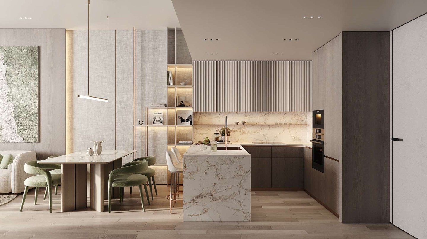 Willkommen in Ihrem neuen Zuhause! Betreten Sie dieses elegante Apartment mit modernen Bodenbelägen in Holzoptik und einer Küche, die mit einer luxuriösen Marmorwandverkleidung ausgestattet ist. Die Möbel in Holzoptik verleihen dem Raum eine warme und gemütliche Atmosphäre.