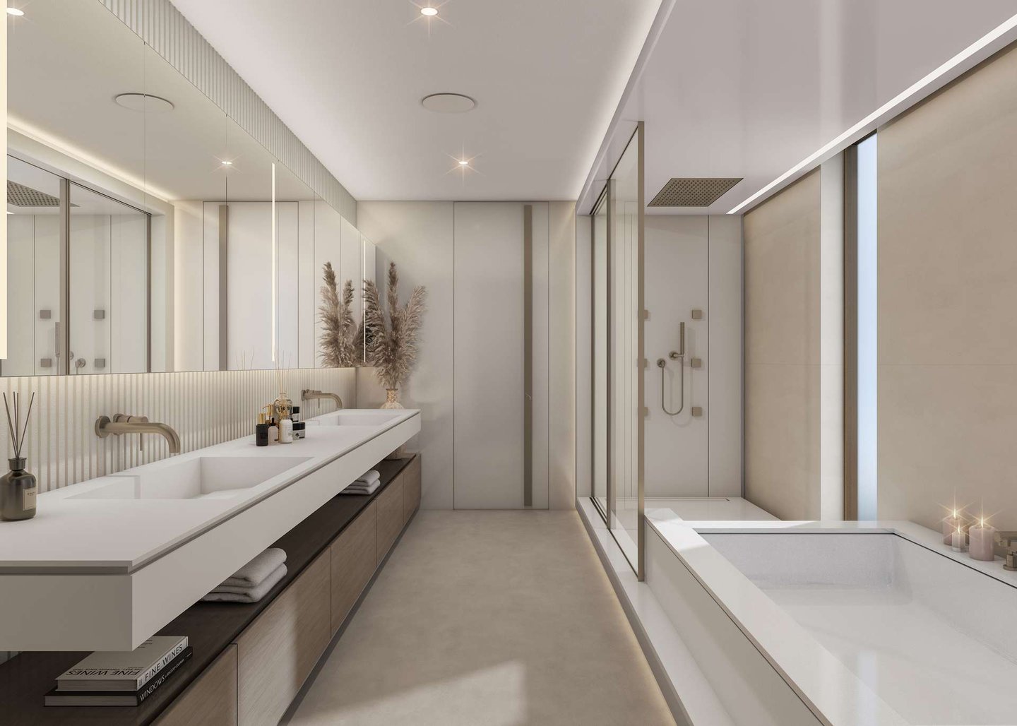 Der Abstellraum bietet ausreichend Stauraum für Ihre persönlichen Gegenstände, während das Hauptbad mit doppelten Waschbecken und einer freistehenden Badewanne ein luxuriöses Wellness-Erlebnis verspricht. Eingebaute Schränke in jedem Schlafzimmer und eine riesige Ankleide im dritten Geschoss sorgen für ausreichend Platz für Ihre Kleidung und Accessoires. Die Eckverglasung und die Terrassenschiebetüren ermöglichen einen atemberaubenden Blick auf die Umgebung.