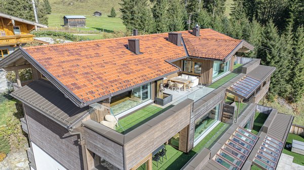Die enorm große Dachterrasse bietet ausreichend Platz. Ein Whirlpool und eine Liegewiese wurde bereits installiert. Zwei kleine überdachte Balkone auf der Rückseite runden den Außenbereich perfekt ab.