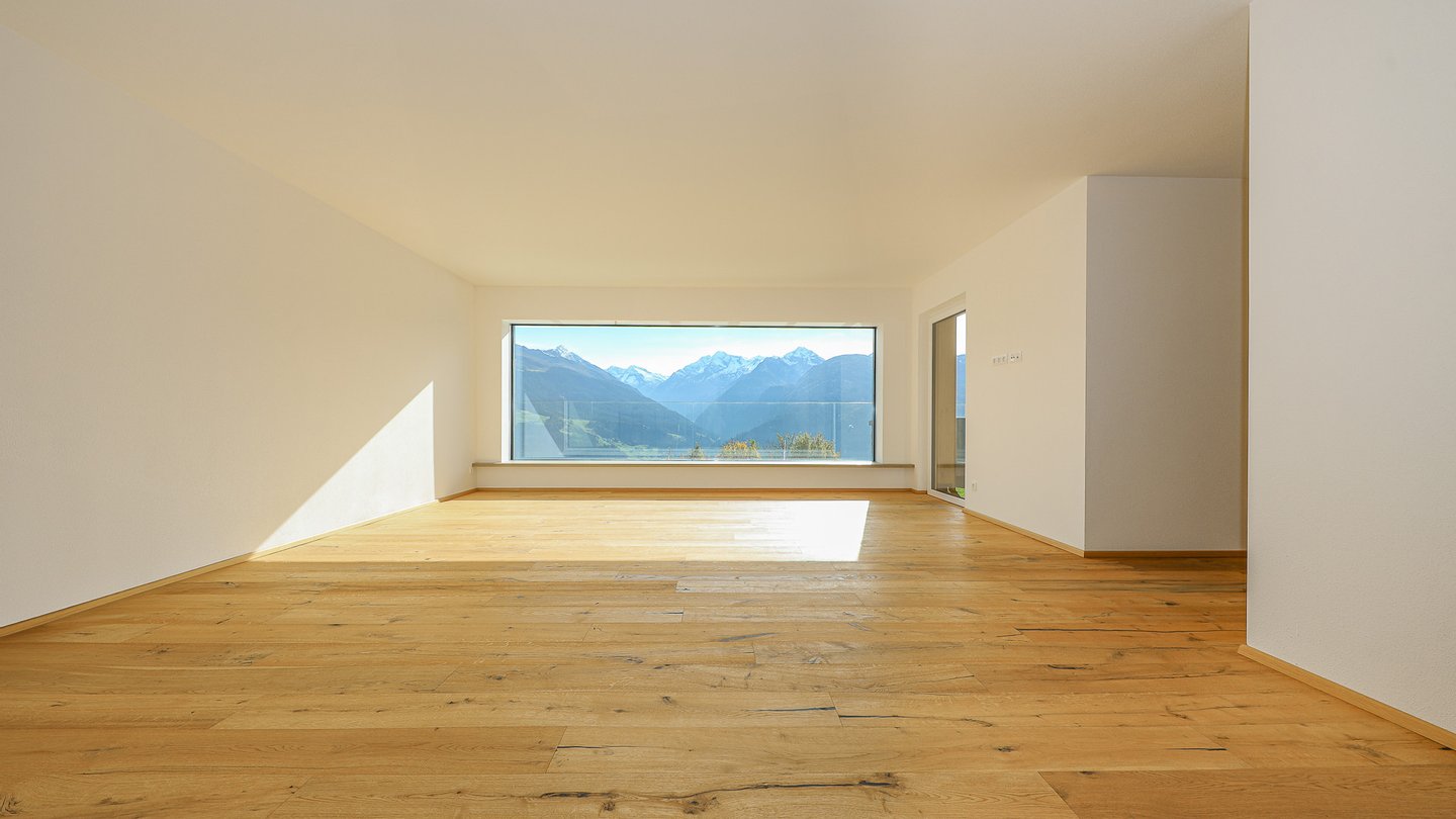 Das Highlight aber ist das 42 m² große Wohnzimmer mit offener Küche und Panoramafenster.