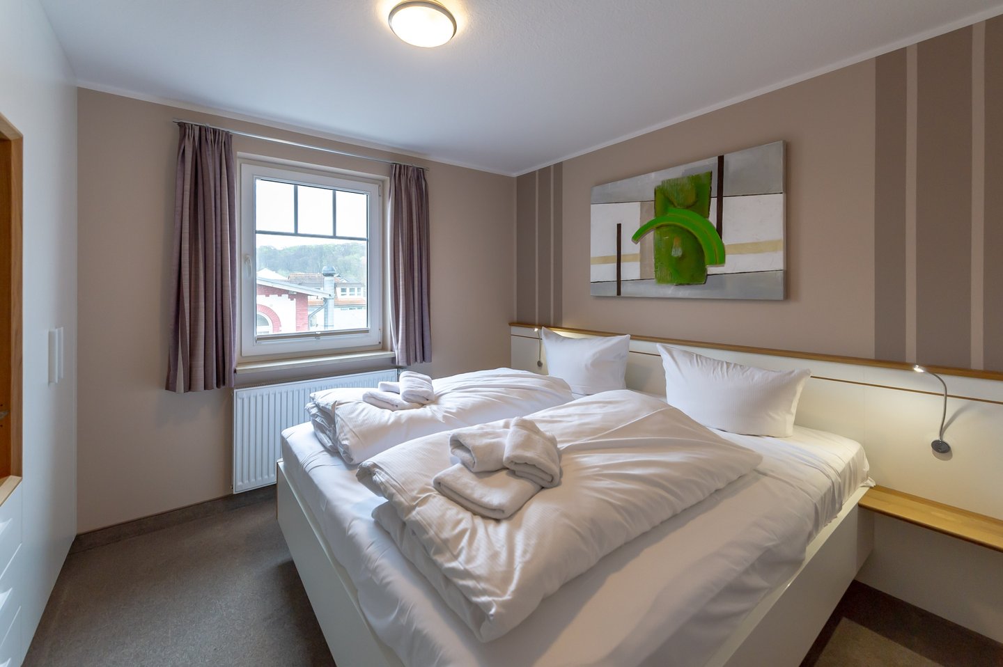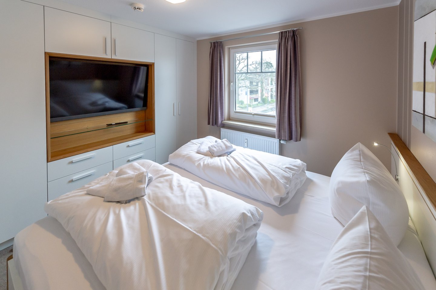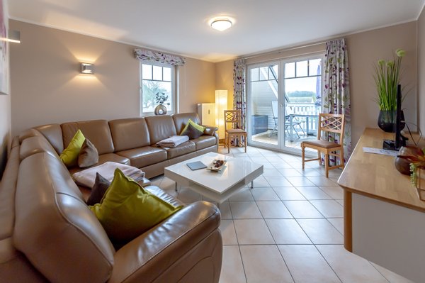 Gleich hinter dem Flur vermittelt der in harmonisch aufeinander abgestimmten Sandtönen gehaltene und nach Süden ausgerichtete Wohnbereich ein großzügiges Raumgefühl. Der angrenzende Südseitenbalkon ermöglicht einen weiten Blick bis hin zur Seepromenade des Naturschutzgebietes "Schmachter See". Die separate Küche ist mit Ceranfeld, Backofen, Geschirrspüler, Kühlschrank mit Gefrierfach und diversem Kleininventar außergewöhnlich gut ausgestattet. Weiterhin verfügt das Appartement über zwei Schlafzimmer mit Doppelbetten und Flachbild-TV, ein großes Duschbad mit Handtuchheizung und ein zweites Bad mit Badewanne. Die Schlafräume sind mit Teppichboden ausgelegt; der Rest der Wohnung ist gefliest. Die Wohnung wurde 2021/22 aufwendig renoviert und modernisiert: So erhielten z.B. beide Schlafzimmer neue Bodenbeläge, Einbauschränke, Betten sowie Fernseher, es wurde eine neue Küchenzeile inkl. neuer Elektrogeräte eingebaut und Wohnzimmer und Flur wurden neu möbliert.