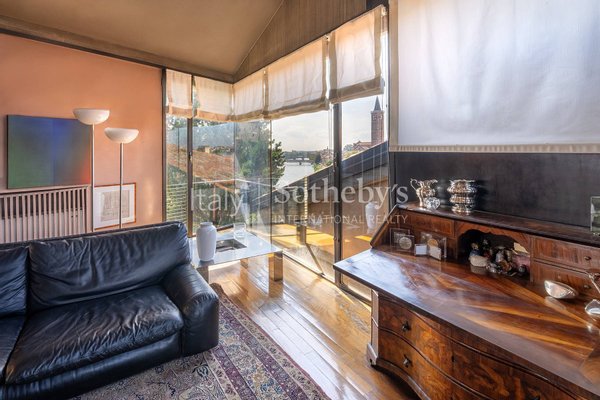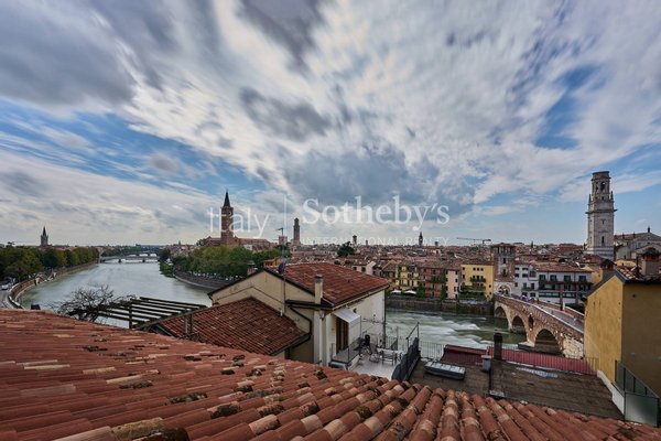 In dem malerischsten Teil der historischen Altstadt von Verona befindet sich diese außergewöhnlich schöne Immobilie, entworfen vom renommierten Architekten Giorgio Ugolini. In erhöhter Lage gelegen, bietet dieses großzügige Penthouse einen atemberaubenden 180-Grad-Blick auf den Fluss Etsch und die Ponte Pietra, auf das Römische Theater sowie auf die grünen Hügel der Torricelle, da die Wohneinheit auf drei Seiten frei liegt.