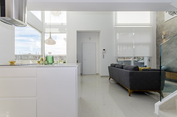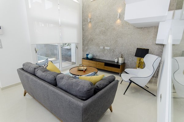 Die Innenräume verfügen über einen geräumigen, offenen Wohn- und Essbereich mit hohen Decken und Fenstern, die viel natürliches Licht hereinlassen, Terrassentüren im Wohnbereich, die Zugang zur Terrasse und zum Garten bieten, eine moderne Küche mit einer Zugangstür zum Grundstück, ein Doppelschlafzimmer und ein Gästebad auf der Ebene des Erdgeschosses. Im ersten Stock befindet sich das Hauptschlafzimmer mit eigenem Bad und ein weiteres Doppelschlafzimmer mit eigenem Bad. Die interne Treppe gibt Ihnen auch Zugang zu der großen Dachterrasse von 45m2 mit Vorinstallation für Sommerküche, Jacuzzi und Außendusche.