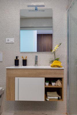 Die Wohnungen sind mit einem Möbelpaket, Küchenelektrogeräten, Klimaanlage, Fußbodenheizung in den Bädern, Einbauschränken in allen Schlafzimmern, elektrischen Jalousien, Innen- und Außenbeleuchtung, Dekoration, sicheren Tiefgaragenplätzen und Abstellräumen ausgestattet. Die Bewohner können die großartigen Einrichtungen nutzen, darunter die schönen Gemeinschaftsgärten mit Naturrasen, Palmen, Springbrunnen und Spazierwegen, den großen Gemeinschaftspool, den Fitnessraum mit Sauna, den Kinderspielplatz, den Petanca-Spielplatz und den Grillplatz.