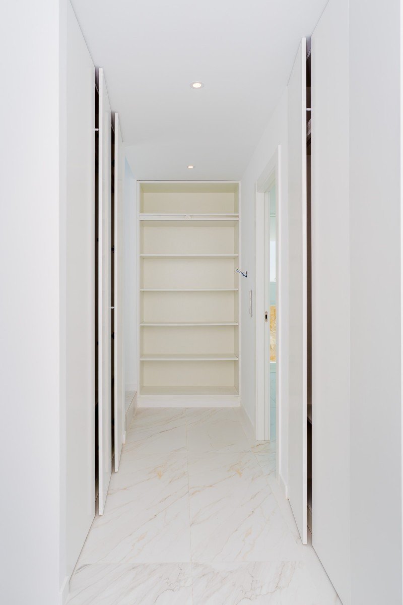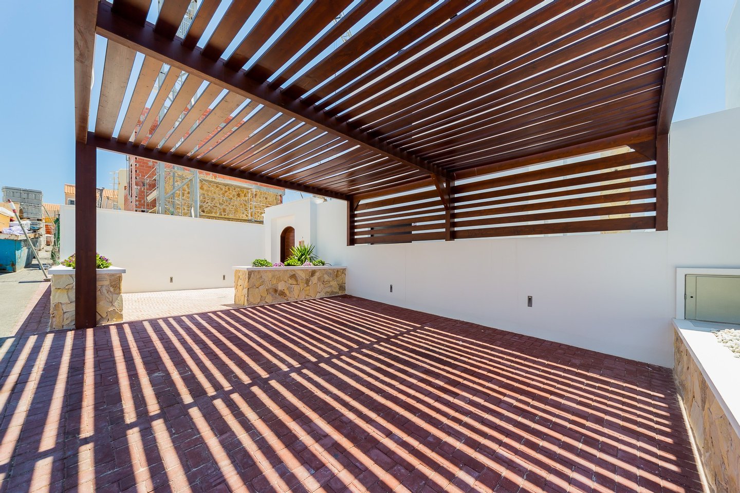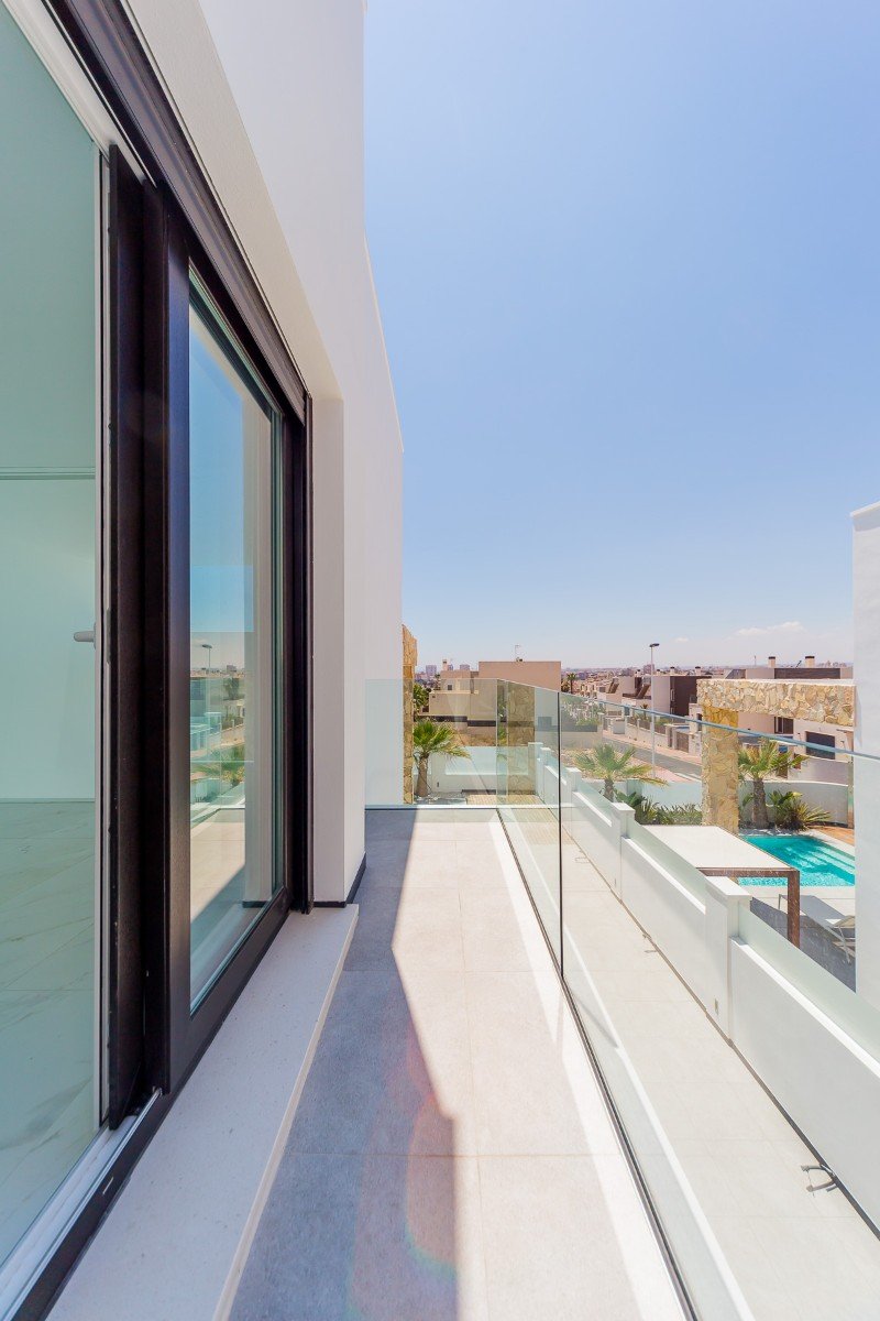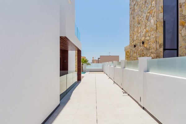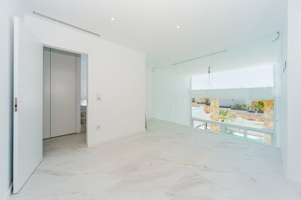 Die Villa verfügt über einen geräumigen Grundriss, bestehend aus einer Eingangshalle, Flur, hochmodernen Wohn- und Essbereich mit hohen Decken und großen Fenstern, die Zugang zum schönen Garten und Poolbereich, offene Küche, Schlafzimmer mit Doppelbett und Gästebad im Erdgeschoss. Die Innentreppe führt Sie in den ersten Stock, wo sich das Hauptschlafzimmer mit eigenem Bad und Ankleidezimmer sowie ein weiteres Doppelschlafzimmer mit eigenem Bad befinden. In der obersten Etage befindet sich die Dachterrasse mit Meerblick. Das Untergeschoss bietet viel natürliches Licht, einen großen Wohnbereich, ein Doppelschlafzimmer und ein Gästebad.