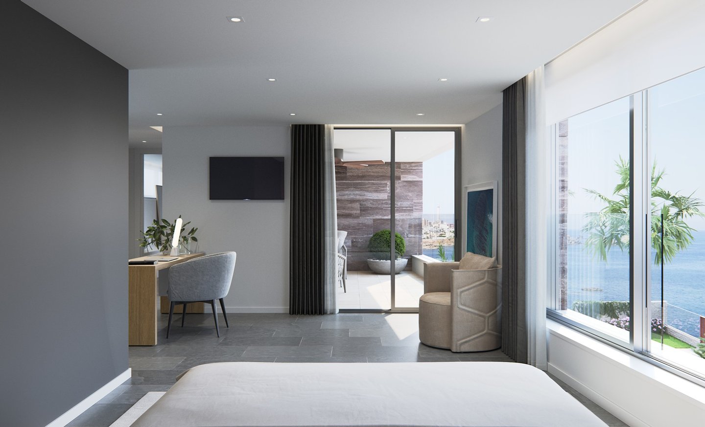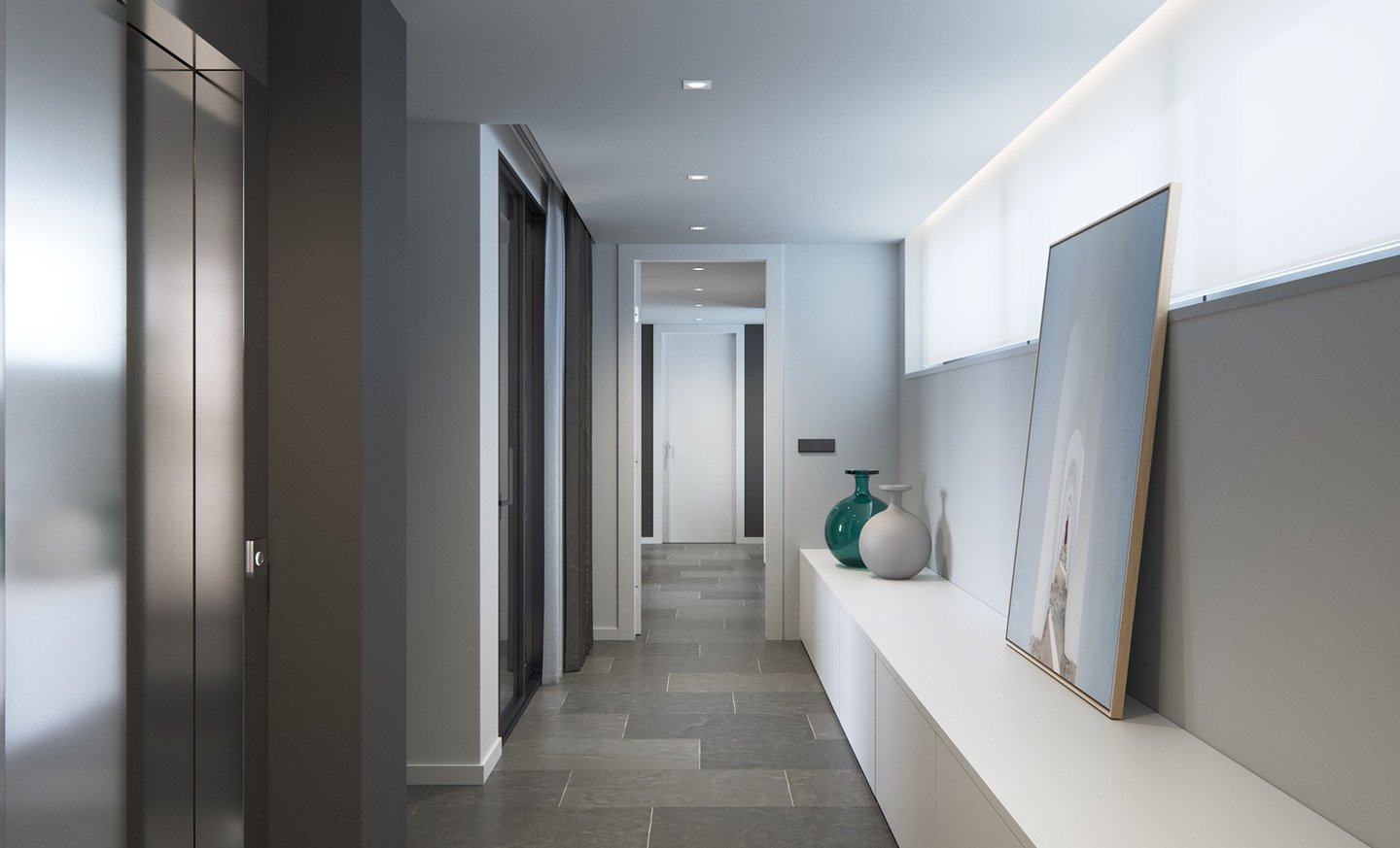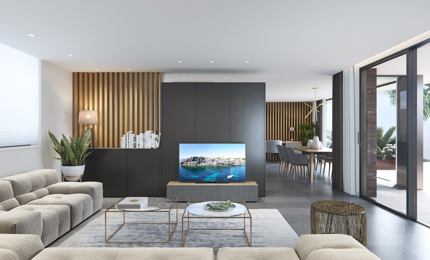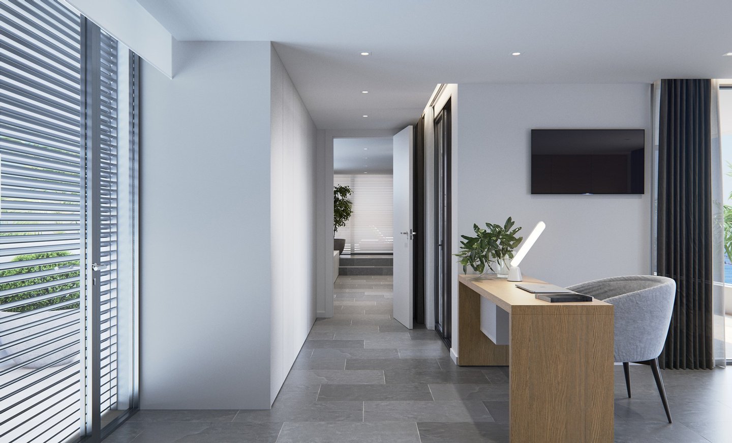 Im Inneren befinden sich fünf große Schlafzimmer, das Hauptschlafzimmer mit eigenem Bad und Ankleidezimmer, zwei Gästebäder und zwei Gästetoiletten, ein moderner und eleganter Wohn- und Essbereich, eine individuell gestaltbare Küche mit hochwertigen Elektrogeräten, die in das Design integriert sind, und ein integrierter Weinkühlschrank. Die Villa ist dank der großen, bodentiefen Fenster lichtdurchflutet und verfügt über eine Fußbodenheizung im gesamten Haus, eine Klimaanlage, einen Aufzug, der in jedes Stockwerk der Villa führt, ein SPA mit Jacuzzi, Sauna und Duschen (optional) sowie einen Wasch- und Abstellraum. Die Villen sind mit TV-Kameras an der Außenseite und Bewegungsmeldern im Inneren geschützt.