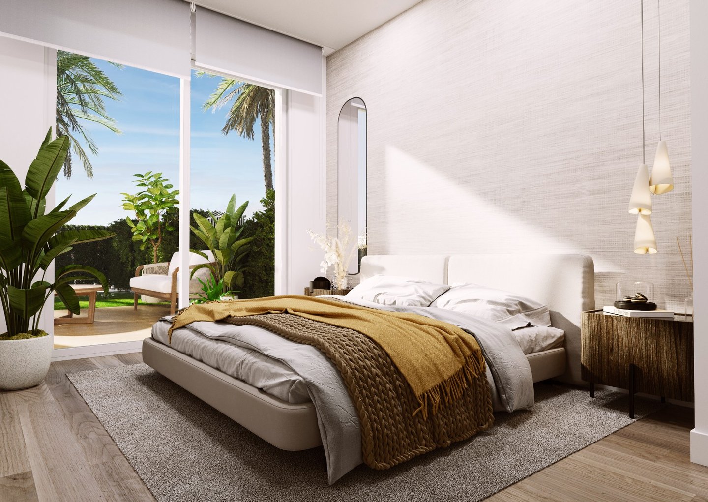 Die Innenräume verfügen über einen geräumigen offenen Wohn- und Essbereich, eine moderne Küche, ein Hauptschlafzimmer mit eigenem Bad, zwei weitere Doppelschlafzimmer und ein Gästebad. Es gibt viel Platz im Außenbereich mit großen Terrassen, Erdgeschoss Optionen haben eine vordere und hintere Terrasse sowie einen privaten Garten, mittlere Etage Wohnungen mit einer geräumigen Terrasse und Dachgeschoss-Wohnung mit Terrasse und große Dachterrasse Solarium.
