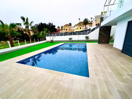 Eine brandneue, luxuriöse, freistehende Golfvilla mit 4 Schlafzimmern, 4 Bädern und privatem Swimmingpool in La Marquesa Golf in Ciudad Quesada (Alicante), die einen atemberaubenden Blick auf den Golfplatz bietet und nur 15 Minuten von den schönen Stränden von Guardamar del Segura entfernt ist.