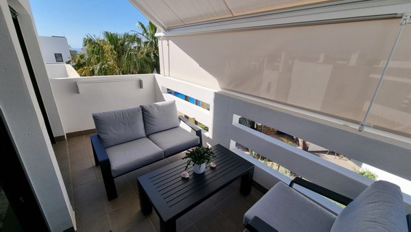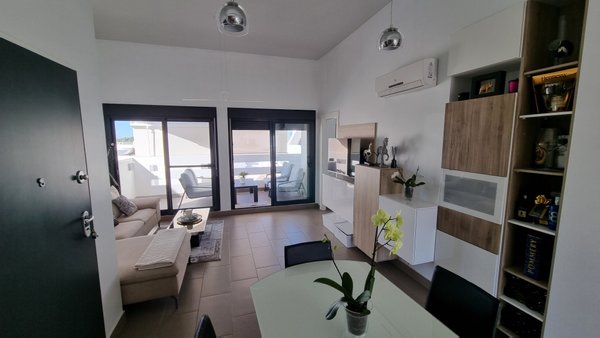 Die Innenaufteilung besteht aus einem stilvollen offenen Wohn- und Essbereich mit hohen Decken, einer voll ausgestatteten modernen Küche, zwei Doppelschlafzimmern mit Einbauschränken und einem großen Bad. Die vorderen und hinteren Terrassen sorgen für viel natürliches Licht in der Immobilie und machen das Beste aus der Aussicht auf die Umgebung. Die Immobilie wird voll möbliert und mit Klimaanlage verkauft.