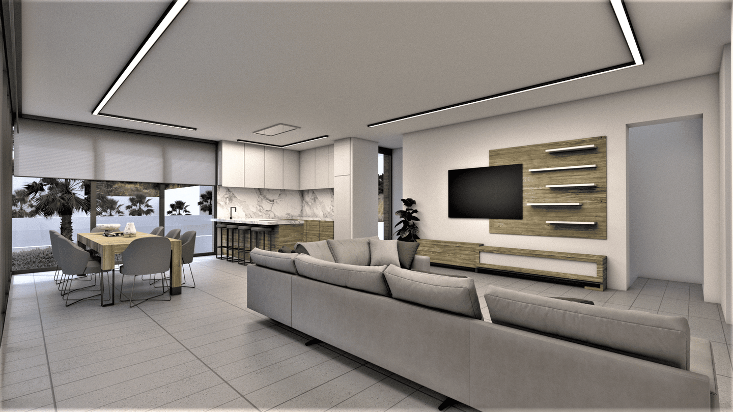 Die Villa erstreckt sich über drei Etagen einschließlich des großen Kellers von 96m2. Das Innere bietet einen geräumigen offenen Wohn- und Essbereich mit amerikanischer Küche, bodentiefen Fenstern, die viel natürliches Licht in das Haus fließen lassen und Zugang zur großen Terrasse und zum privaten Swimmingpool bieten, sowie ein Doppelschlafzimmer mit eigenem Bad und ein separates Gästebad. Die interne Treppe führt Sie in den ersten Stock mit einem geräumigen Flur, zwei weiteren Doppelschlafzimmern mit en-suite Badezimmern, beide Schlafzimmer im ersten Stock haben Zugang zur Sonnenterrasse von 33m2. Über die Treppe gelangt man auch auf die 79 m2 große Dachterrasse, auf der man den ganzen Tag über die Sonne und den Meerblick genießen kann.