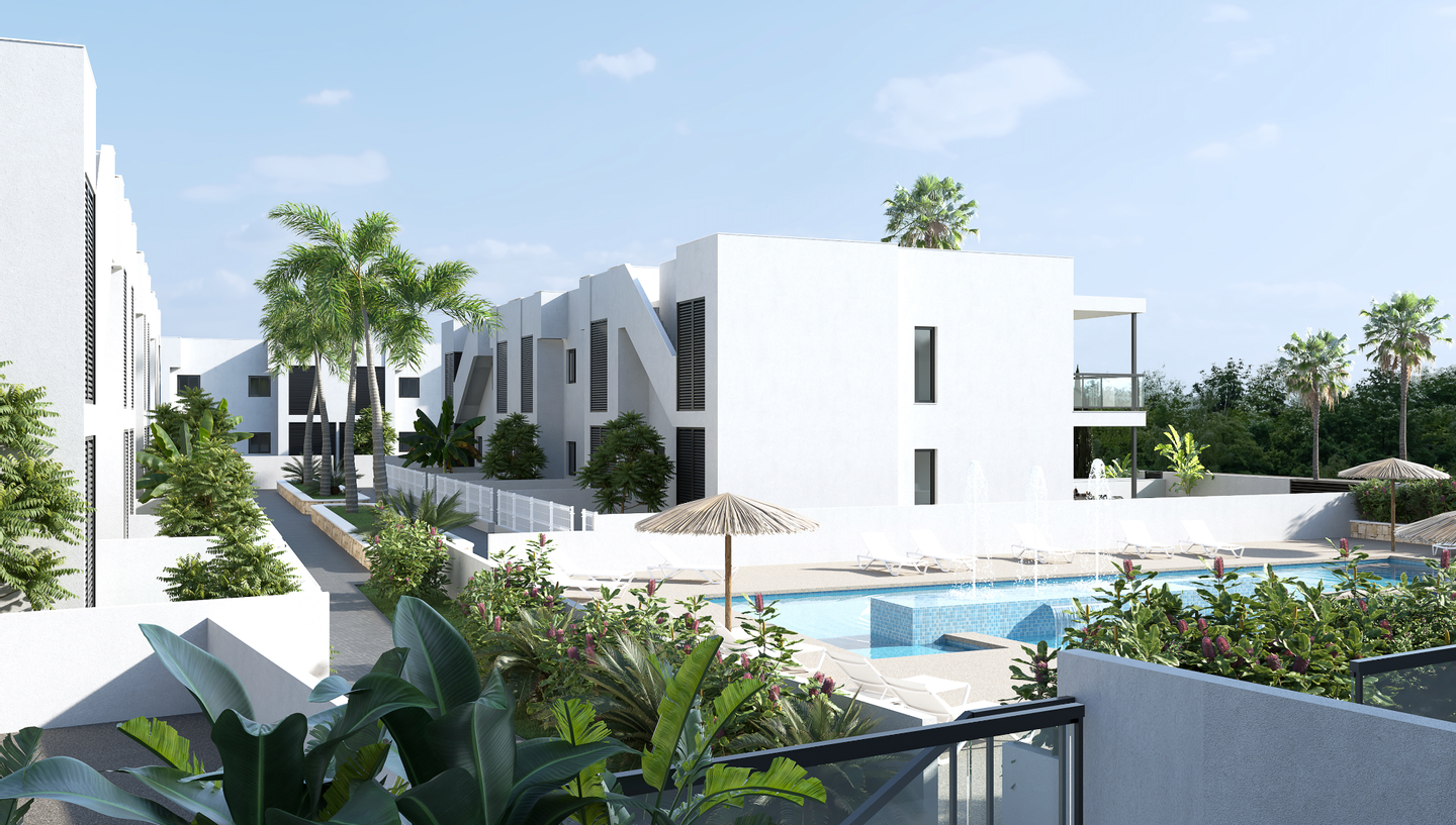 Die Wohnanlage verfügt über einen schönen Gemeinschaftsgarten mit Swimmingpools für Erwachsene und Kinder, die den Bewohnern zur Verfügung stehen. Sie haben die Wahl zwischen Bungalows, die im Erdgeschoss einen privaten Garten und im Obergeschoss eine private Sonnenterrasse haben, oder zwischen Wohnungen im Erdgeschoss, im ersten Stock und im Dachgeschoss mit großen Terrassen, wobei die Wohnungen im Dachgeschoss auch über eine große Sonnenterrasse verfügen.